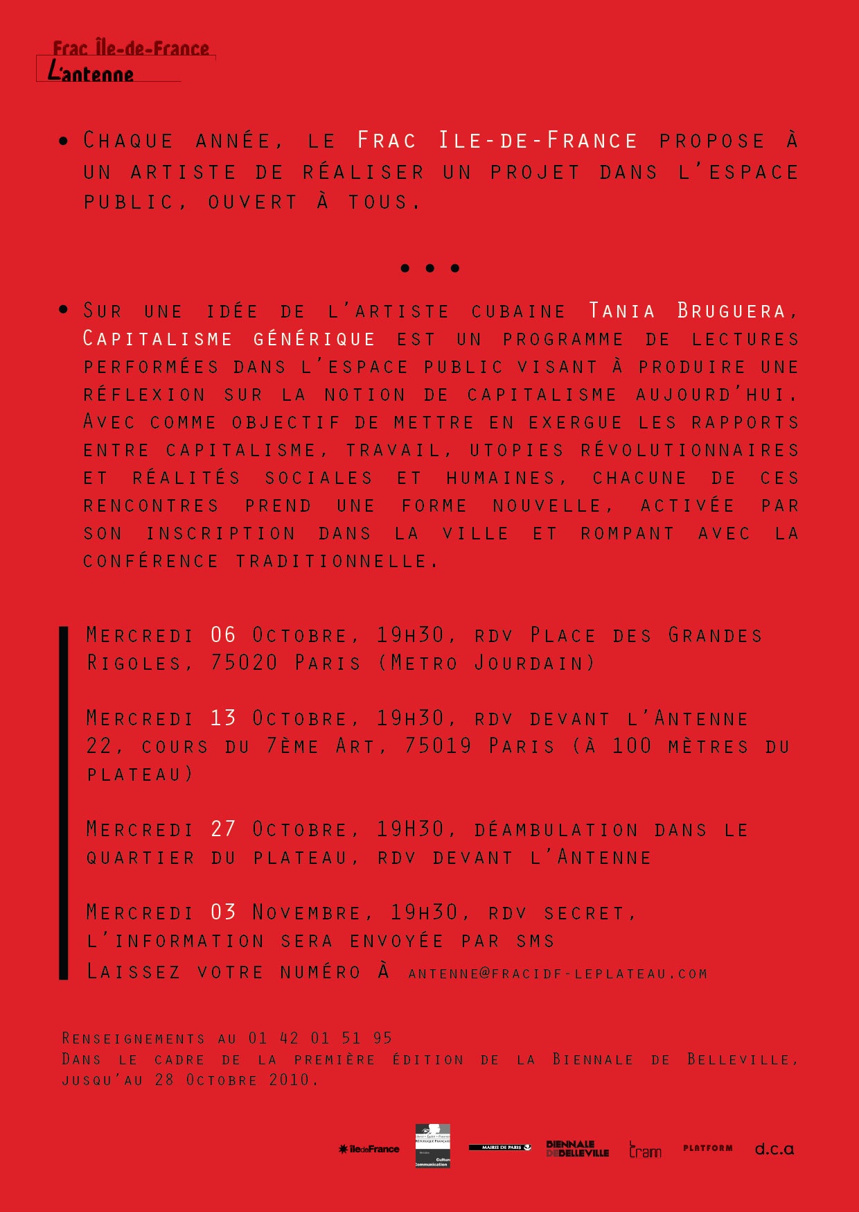 Generic capitalism, on an idea by Cuban artist TANIA BRUGUERA, is a program of readings cum performances in public space aimed at creating a reflection on the notion of capitalism today. With the purpose of highlighting the relationships among capitalism, work, revolutionary utopias and social and human realities, each of these meetings takes a new form, stirred up by being inscribed in the town and breaking with traditional lectures.