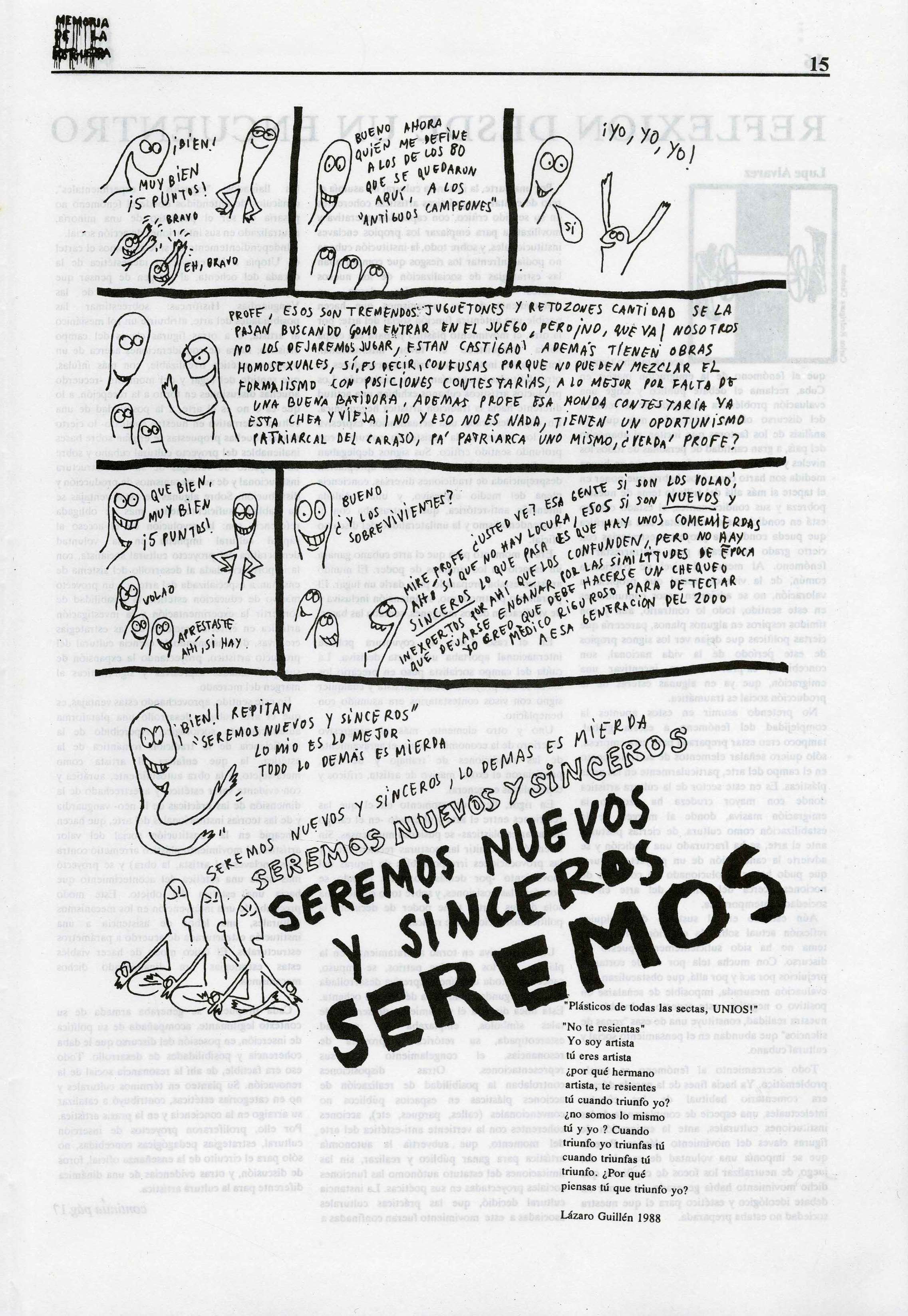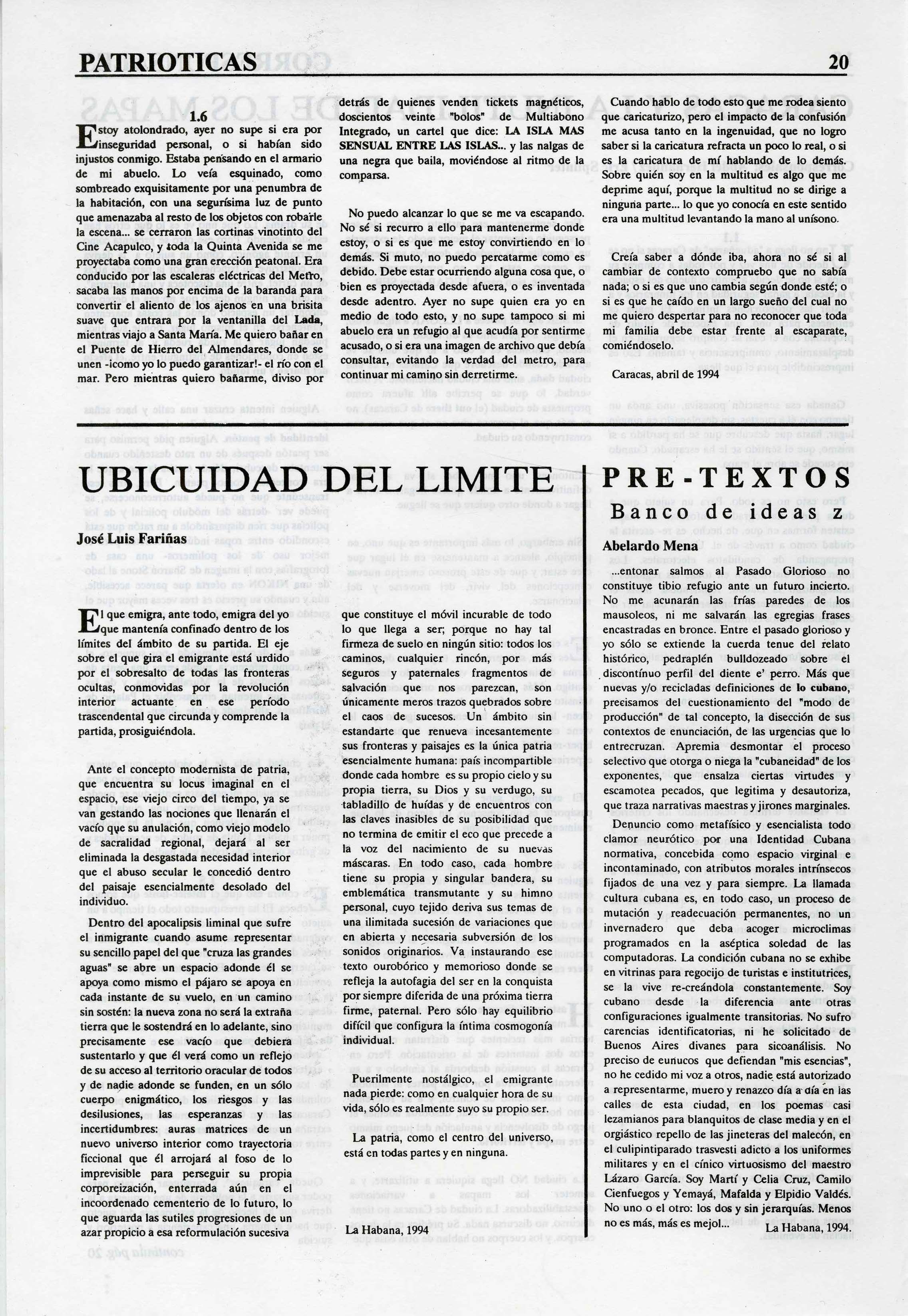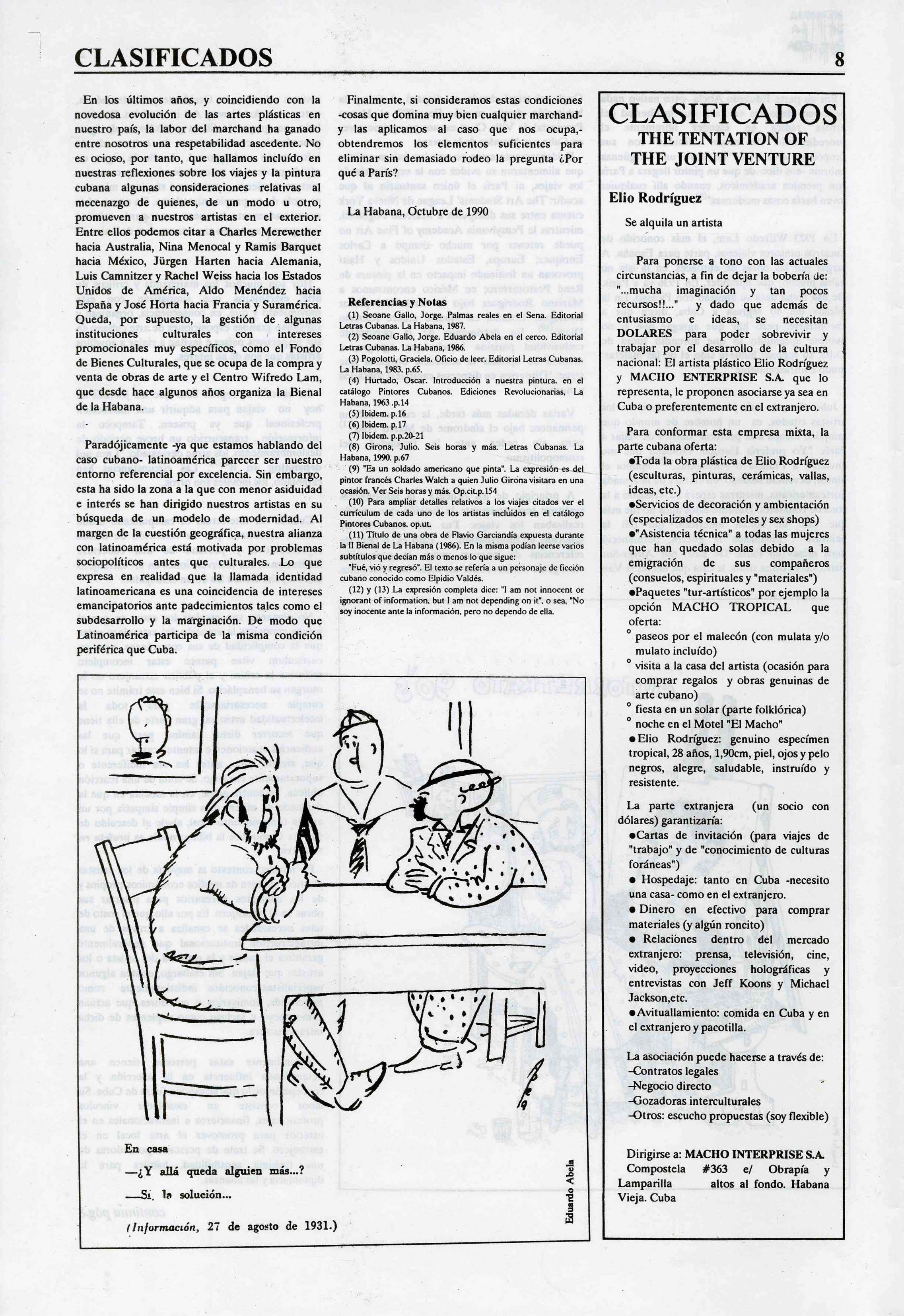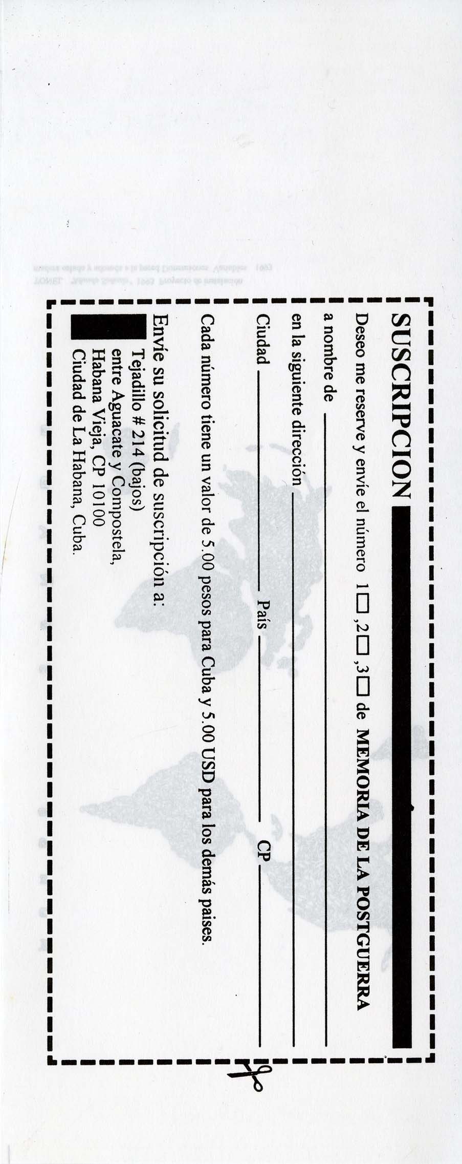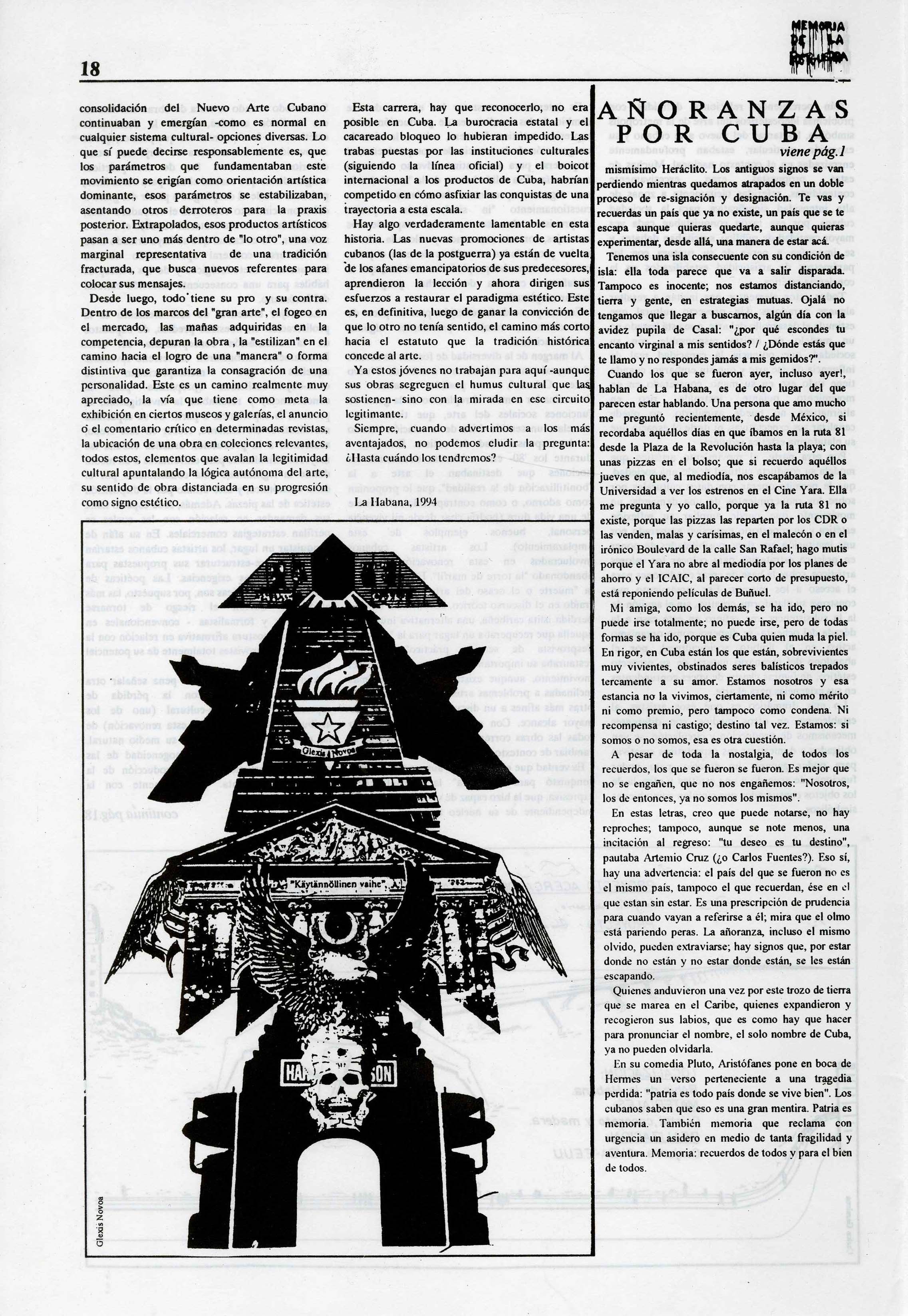 “Under this title-dripping with fresh pain or blood -a new publication has appeared in Cuba. Half-way between an art journal and a newspaper- not in terms of its presentation, which is economic and textual, but at the conceptual level, Memoria is an unusual event in the cultural life of Cuba of the last decade, with an outstanding presentation at the recent fifth edition of the Havana Biennial, is the creator and director of the publication, the first issue of which was distributed at her installation at the Biennial. The publication is self-financed and gathers together ideas by artist and critics who want to express their views. Neither of these features suffices to describe the journal. What is noteworthy is the fact that at a time of unprecedented economic crisis in which distances have grown almost ad infinitum due to the lack of transport and the international dispersion of artist, Memoria has not only assembled ideas but has helped maintain a sense of coherence. The publication appears at a time in which Cuban art is running the risk of losing the cultural coherence the previous decade. With the goal of providing guaranteed employment for artist and attracting tourism to bring in foreign currency, Cuban artist have become part of a market which is increasing by similar to the Western market. Dialogue with the Cuban people (and between artists themselves) is threatened with replacement by competition, and the former cohesion is being loosened by migrations due to the economic factors. Memoria evidences the intense outside activities carried out by our colleagues over the last three years with a list of 105 artist who have emigrated; a very small fraction of them have used political exile as the reason for their departure. In this departed, Memoria acts as a magnet for ideas. It is, over and above the gossip and correspondence, a primary vehicle for communication. The texts, sometimes cloistered within a vernacular hermeticism, other times of a clearly humoristic nature, resume the path of sane demystification established by the las generation of artists from the 1980s. Lazaro Saavedra, a member of that generation, describes his new work (in a text from the 1990:) the clay vessel, copied from a native design and thus genuinely national, ,will have a popular impact, and will bring art to the masses., since it will be mass produced , and thus solve its own financial problems. At the same time, since it will also be sold to foreigners, currency will flow into Cuba, and the work will be a vehicle for our ideology which wil l threaten the repulsive capitalist system>. Meanwhile, Kcho (Alexis Leiva) reproduces the form on which his application for a visa to United States was refused, which begins with the words: <You have been denied a non-immigrant visa under section 214(b) of the United States Immigration and Naturalization Act. Under this Act, an applicant for a non-immigrant visa is considered an immigrant>. Alejandro Lopez analyzes in detail the use of time in artistic creation, 0.9 per cent, which he promises to reduce even further for the Day of Cuban Culture. He explains that <I want in this way to show my comrades that despite the difficulties we face, it is still possible and even necessary to do less art…>. Memoria brings together the artists who have remained in Cuba and those who left recently. While the separation from the <moles> is preserved and becomes less marked in the case of the <Marielitos>, there seems to be no separation from those who have only recently left. The diaspora is more an expansion than a break and Memoria is one of the spontaneous instruments which helps promote cohesion. The second issue deals almost entirely with exile and the diaspora, as seen from the island and from the outside, both historically and poetically. One of the serious notes (by Lazara Castellanos) recalls Angel Acosta Leon with the subtitle Suicide is the continuation of exile. Over and above all this, Memoria may well be a new spearhead of Cuban art -a new proposal which brings together the writer and the visual artist in their dommon concerns, where the visual artist joins to form a hybrid with the writer and discovers and voice which is equally eloquent with words as imagesimages. In the meantime, Memoria is also a free enterprise satire, not only because of the fact of its actual appearance, but because of the devices applied to self-mythification. The publication not only adopts the traditional format of editorial, letters, and sections (which lose their meaning when the titles are read), but includes advertisements offering non-existent services (<photocopies of passport documents>) or space for publications on unrelated issues. Bruguera goes around with little gifts with the publication’s logo (ashtrays, key rings, pen holders, etc.) for potential contributors. Memoria de la postguerra, in its first two issues, has become an essential source of documentation for anyone wishing to learn about Cuban culture at these critical times on the island. Thanks to this little publication, the diagnosis of the country’s health is good, despite the enormous lack of material resources. Unfortunately, rumors are circulating that the publication does not have the approval of Cuban bureaucracy. It would be very unfortunate if, at such a time of economic crisis, which so seriously affect the scope for creative work by Cuban artists, this alternative journal should cease to exist. Memoria is one of the necessary vehicles, which an entire generation of artists need if they are to maintain their cultural coherence and mental health throughout this period of anxiety ”.