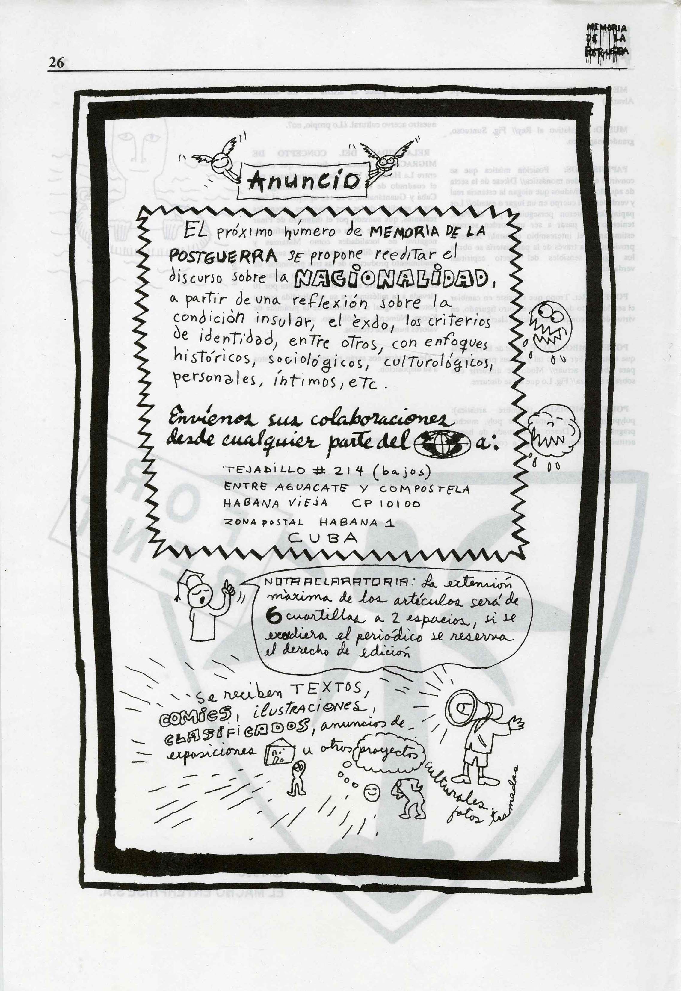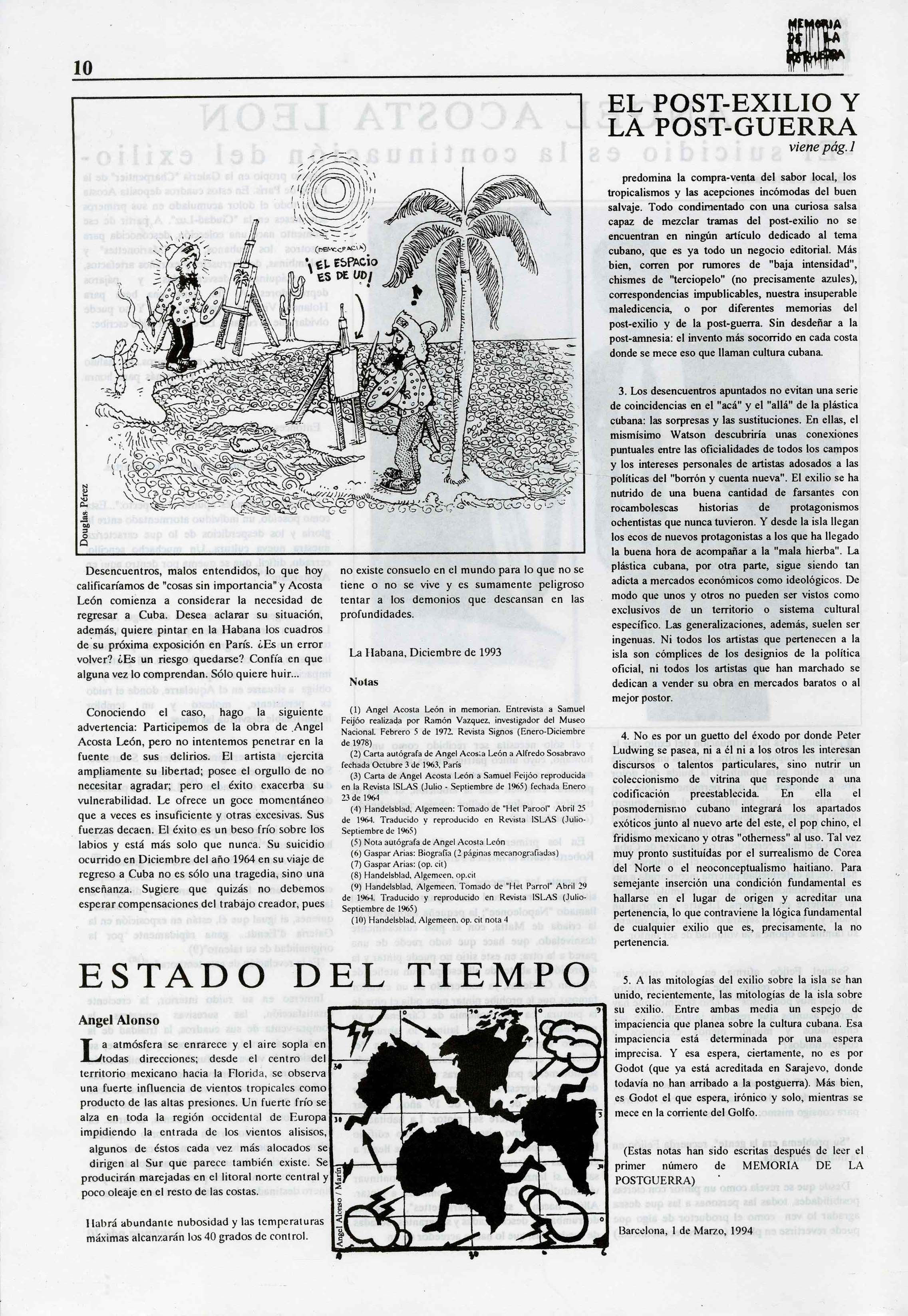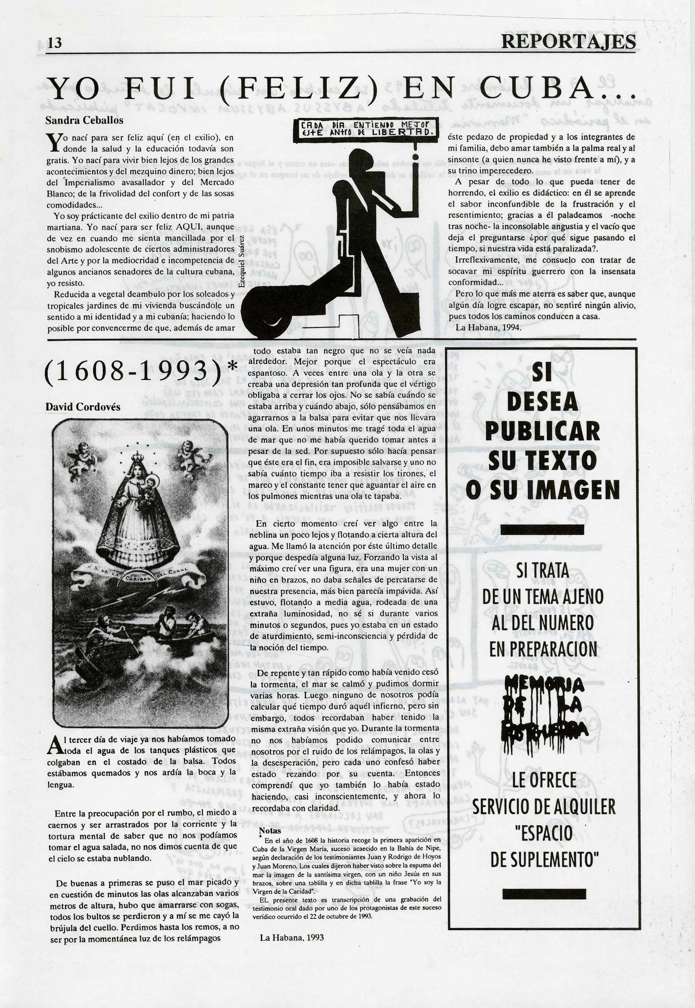 Postwar Memory II focuses the topic of exile and migration. A massive exodus took place in Cuba in the late eighties and early nineties. Artists, critics and art historians stayed abroad because of state repression and censorship on the exhibition proposals and productions of the so-called “eighties generation.” At the same time, civilian residents in general launched themselves to the sea following the route to Florida in an attempt to escape deprivation. This came to be known as the “rafter’s crisis” of the ’94 which caused numerous deaths because of the precarious state of the crafts used. This edition of the newspaper was a space for polemics on the situation and a way to express national inconformity from the field of culture.