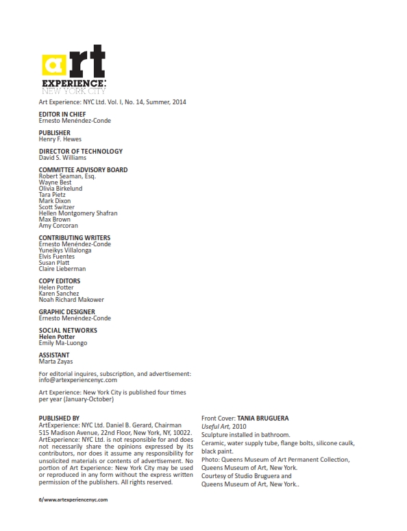 From: Menéndez-Conde, Ernesto. “ARTE ÚTIL an interview with Tania Bruguera,” ARTEXPERIENCE: New York City, Visual Art Magazine. Vol. I, No.13 (Summer 2014) Ed. Ernesto Menéndez-Conde, Publisher Henry F. Hewes New York City, United States (illust.) pp. 34-63