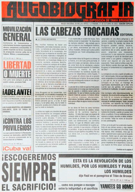 “(…) The same mechanism was used in Autobiografía, presented at the 8th Biennial in 2003, in the form of a sound installation. During which the spectators found themselves being engulfed by slogans of the Cuban Revolution, diffused at a high volume by two loudspeakers. The same work then took the form of a CD, produced under the collective name Las Chancletas Vanguardistas (…)”