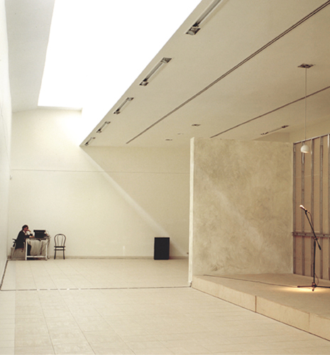 Autobiography(Version inside Cuba) was held in the Museo Nacional de Bellas Artes (National Fine Arts Museum) in Cuba during the 8th Havana Biennial (2003). In the white unpainted space there are still some residues of a former exhibition (holes on the wall, marks of paintings that were hung there and so on). Two Soviet loudspeakers are placed at both sides, a dais in the center framed by three sides with unfinished plasterboard walls. There is a microphone standing on the dais. The glass walls at the entrance are covered with egg trays to muffle the sound outside so as to create a shock effect when entering the space and experiencing a sudden change from silence to the sound coming from the loudspeakers at a high volume. From the installation, comes the sound of reiterated slogans from the repertoire used by the Cuban Revolution in its political propaganda: “Fatherland or Death!” “Victory Forever!” and others. But some of these endlessly and passionately repeated slogans have lost a context justifying them. The audience may go up the dais and use the mike. Then they will notice(because of some subwoofers placed under the dais) the vibrations of the slogans coming from the loudspeakers running up their legs. The mike does not work although it seems to be connected with the amplification equipment that the security guard in the hall keeps in a gesture of apparent control.