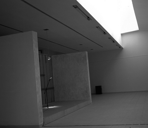 Materials: Unpainted space, two Soviet loudspeakers from the ‘70s, egg trays, a wooden stadium, 16 subwoofers, a switched-off mike, three unfinished rock walls, an electric bulb