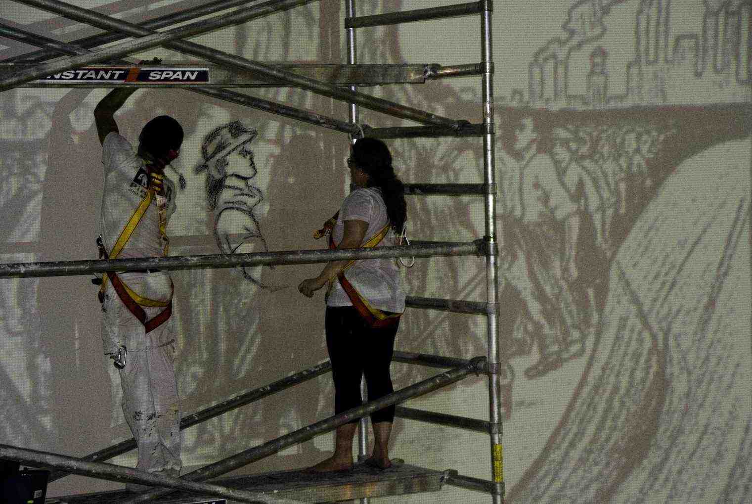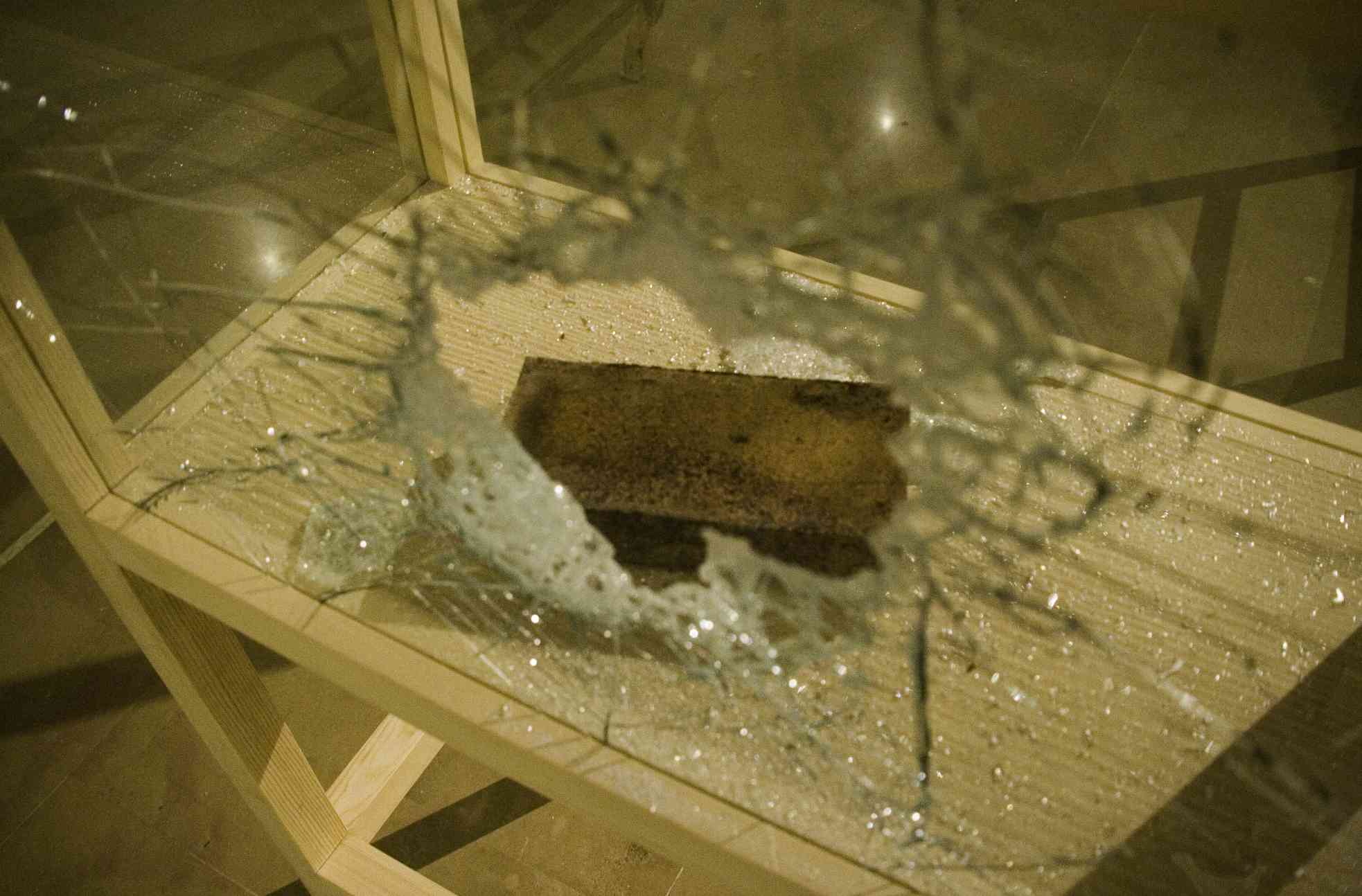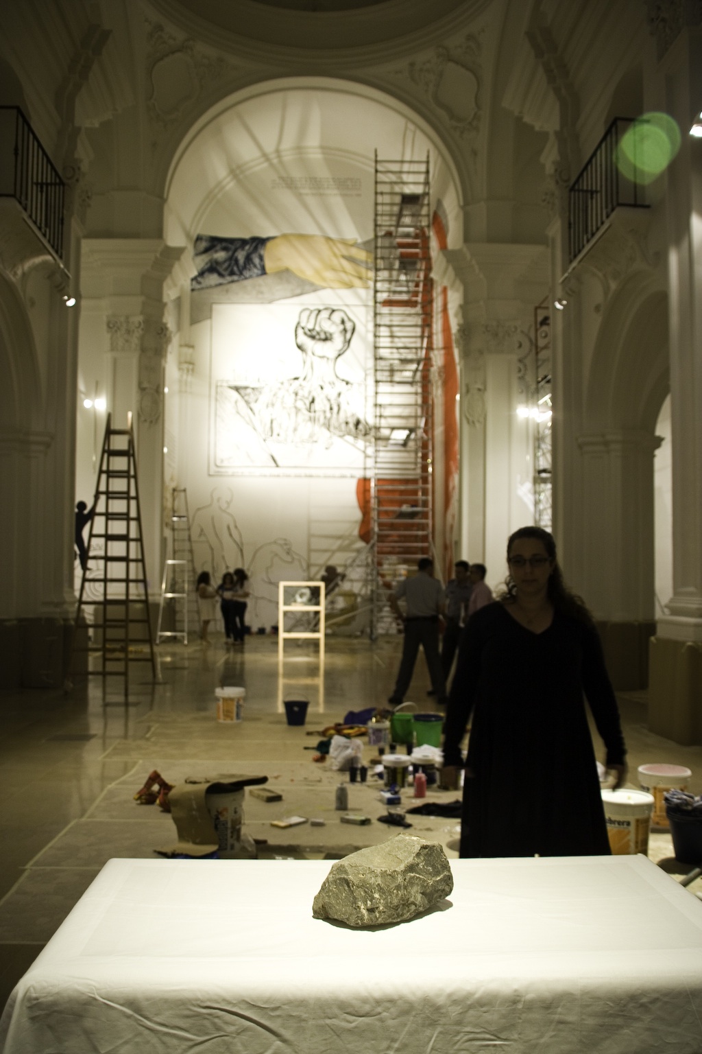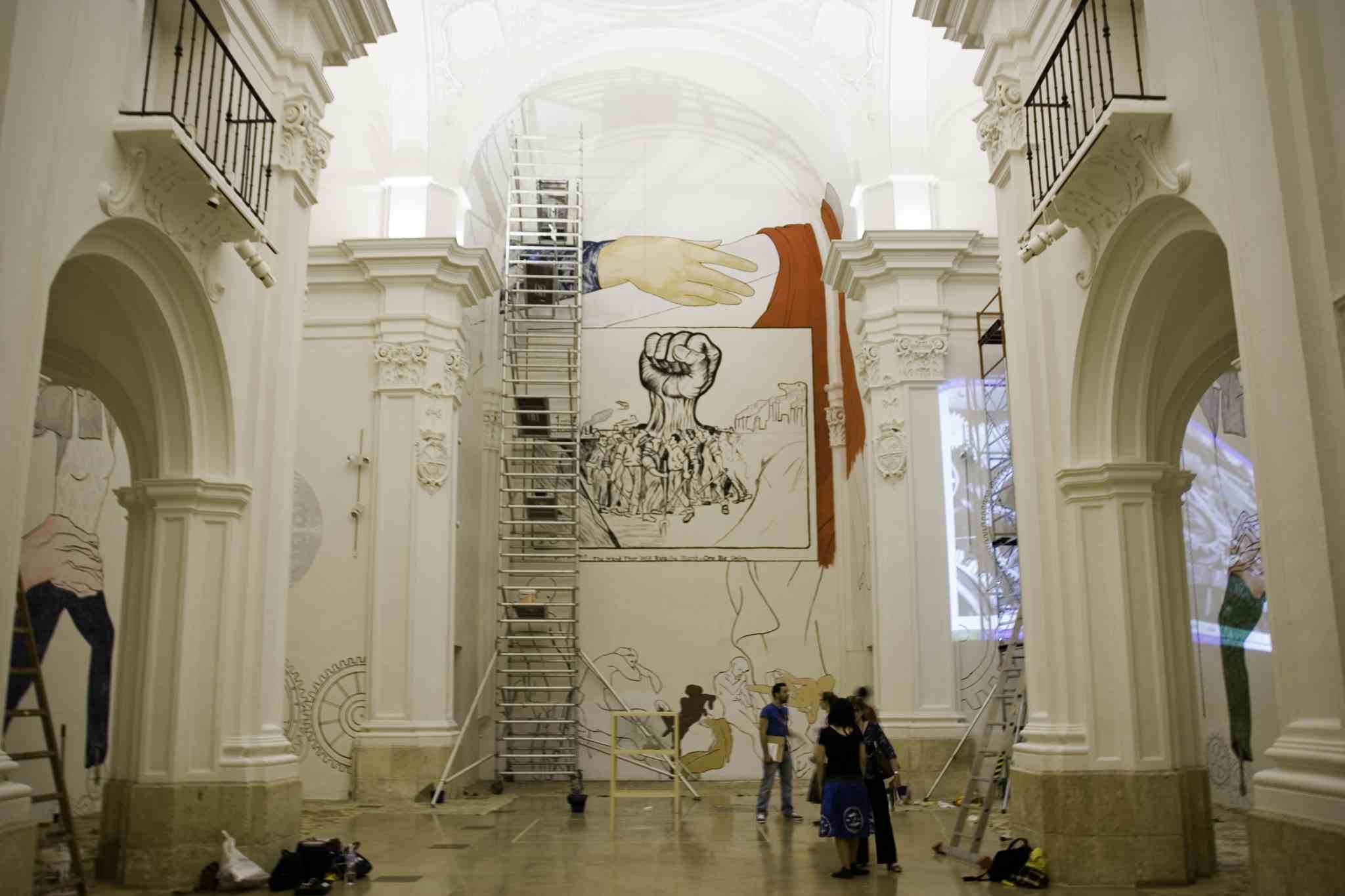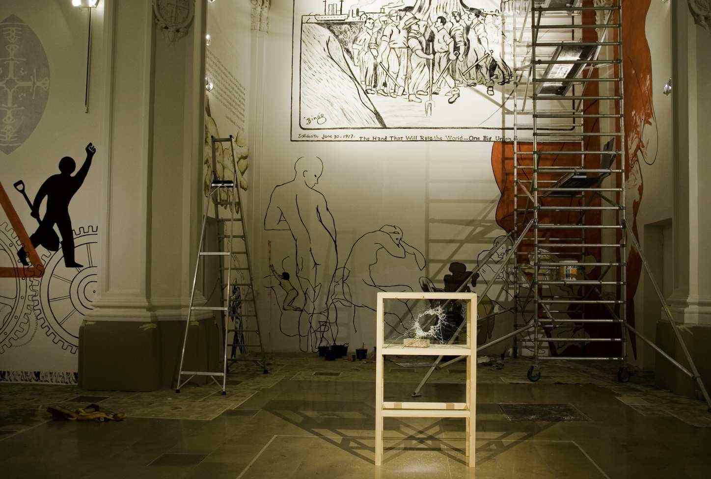 Materials: Demystified church, water painting, paintbrushes, scaffolding, audience participation, images used in political propaganda, projector, news on the General Strike, brick in a showcase, spray on canvas.