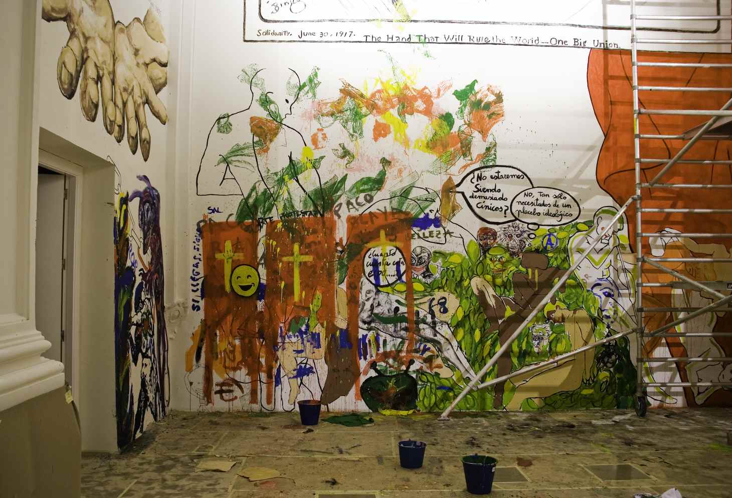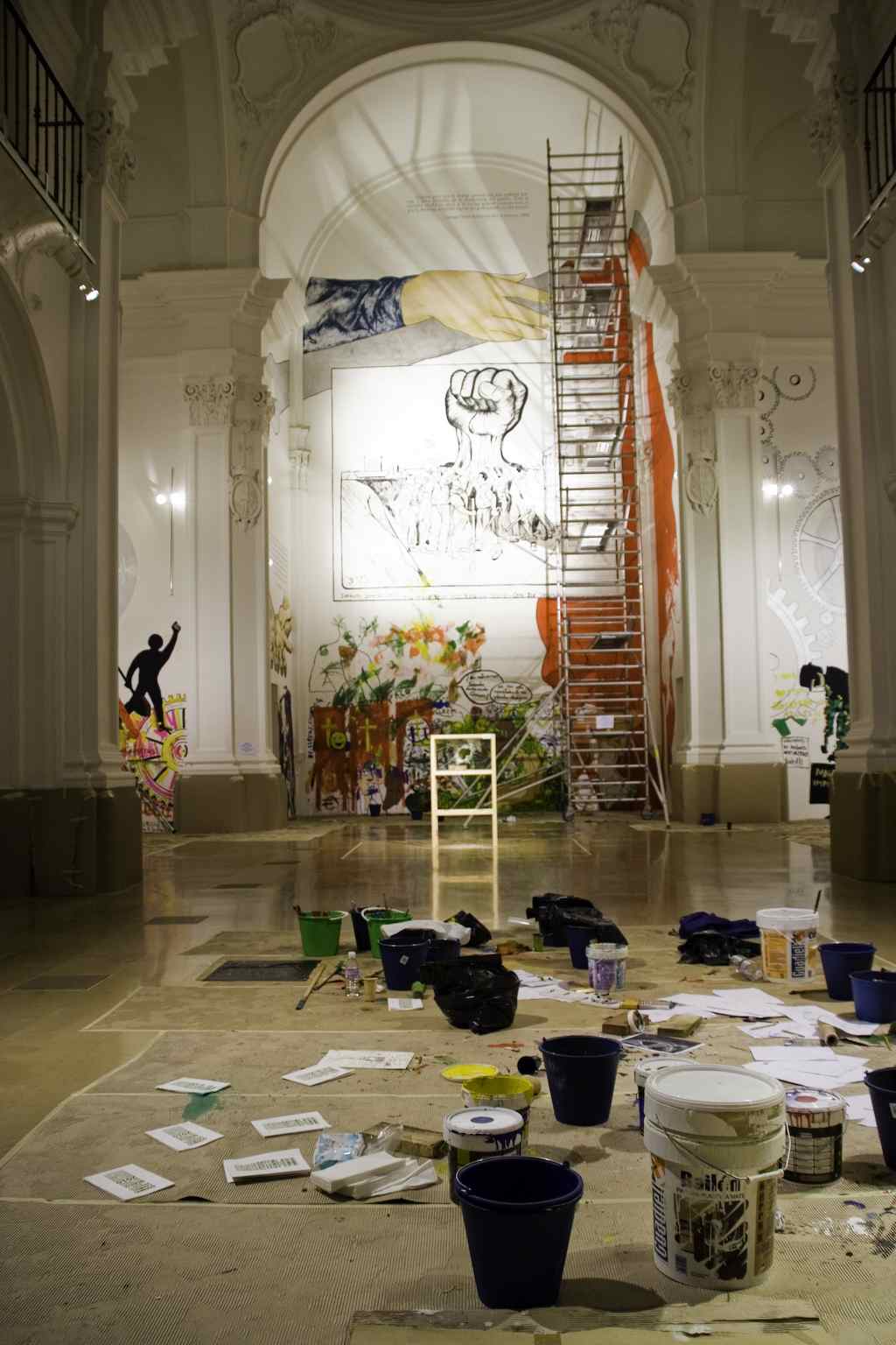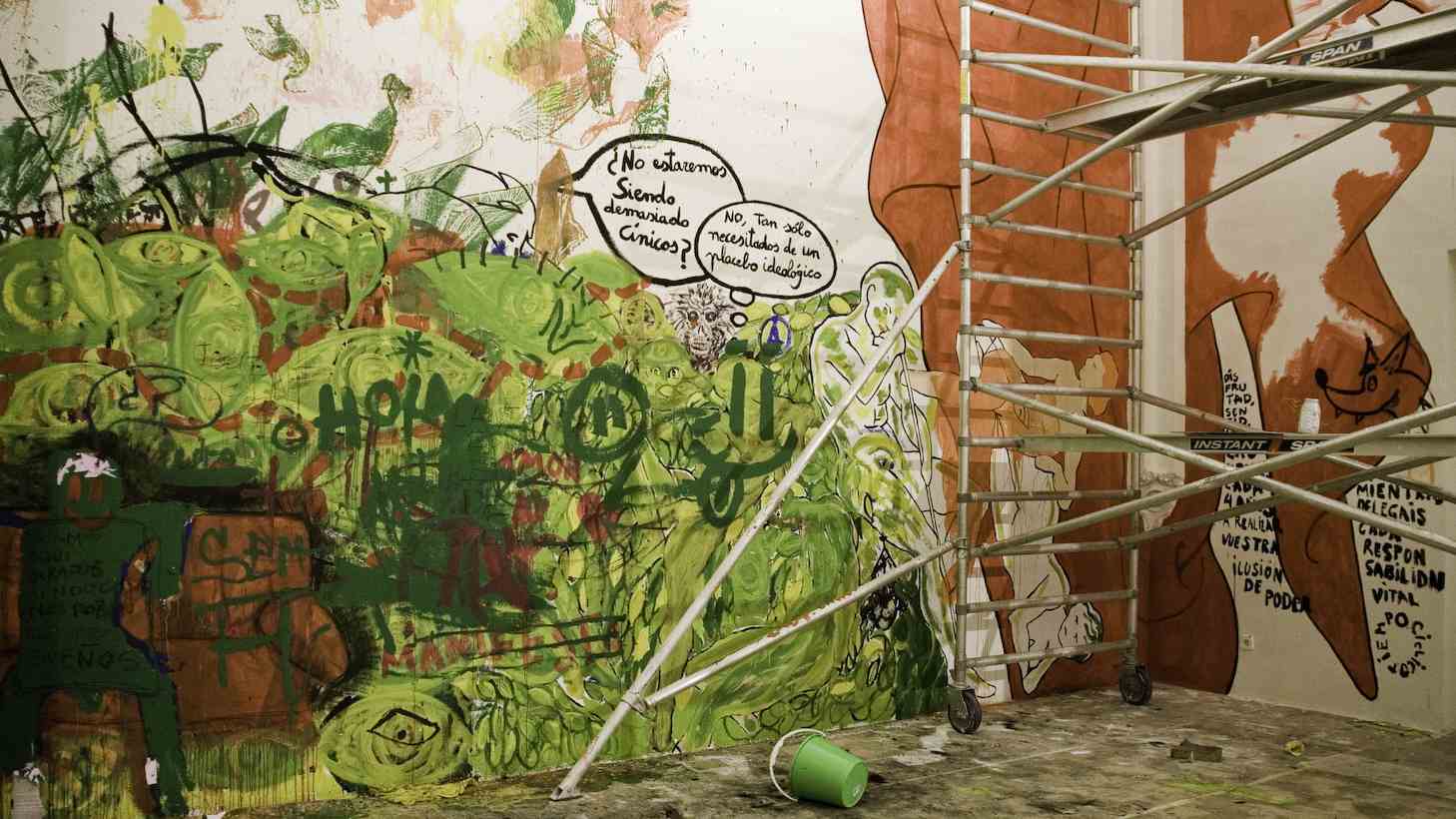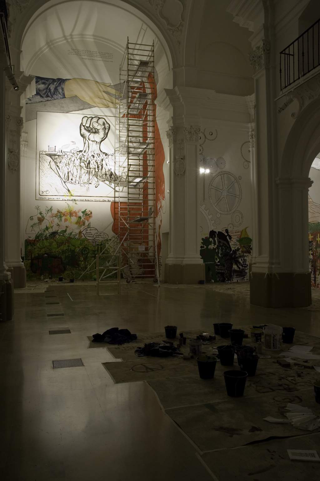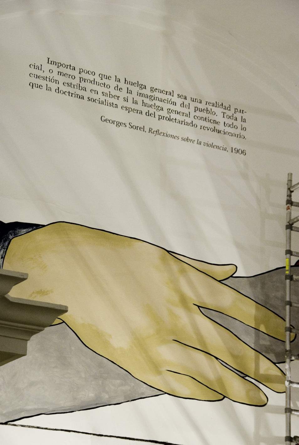 The piece fell within the circumstances created by the call to General Strike in Spain on September 29, 2010. This was the moment in which the piece was being physically produced in the exhibition space. It began with indications to paint on the walls images of the revolutionary iconographic tradition of several leftist political cultures. The purpose is to create a space inviting the participation of the audience by inciting it to paint and create its propaganda proposals on predetermined images. The intention is to generate new images having to do with the topic of the political expression. The artist makes two traditions of political production coincide: participation art and mural tradition as a way to social unrest. The mural’s weave and the series of phases the artist expects to introduce in the painting try to absorb a temporary circumstance: the call to general strike with which, on September 2010, trade unions, citizens and activists intend to question the economic and public financial policies with which the Spanish government wanted to control the variations in the capitalist crisis. On the basis of the implementation of this mural, an attempt at inciting reflection on the political effectiveness of images in the creation of a community and in citizen participation in political processes is made. The purpose is to present a frustrated utopia in which representational art reflects a process as changing as politics and as volatile as public opinion on something as unchangeable as a visual image painted in a mural.