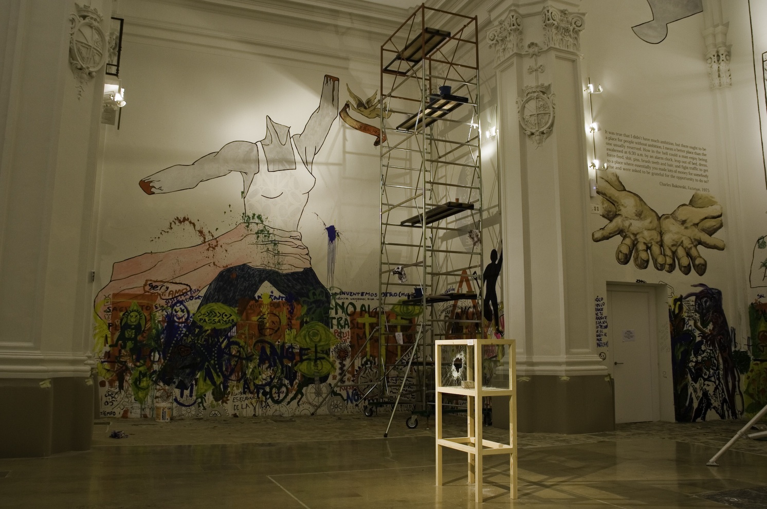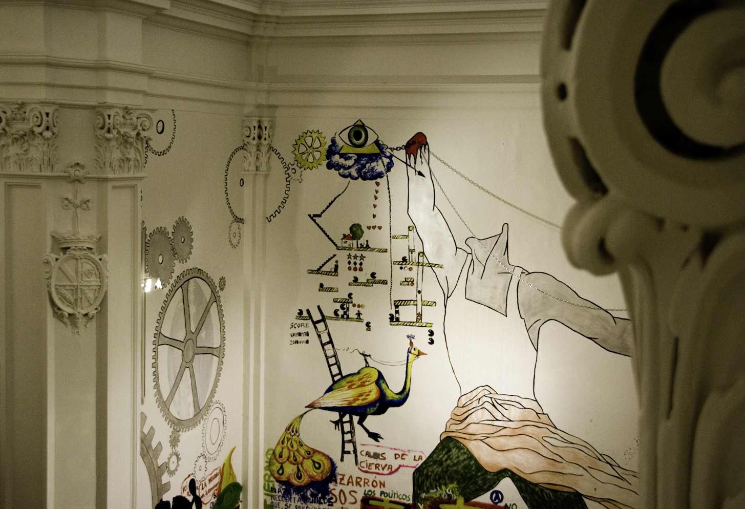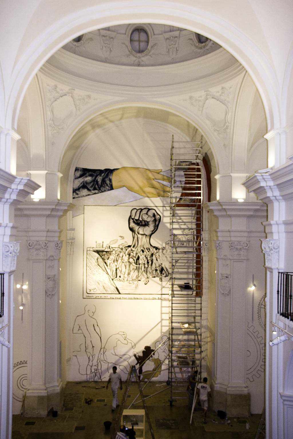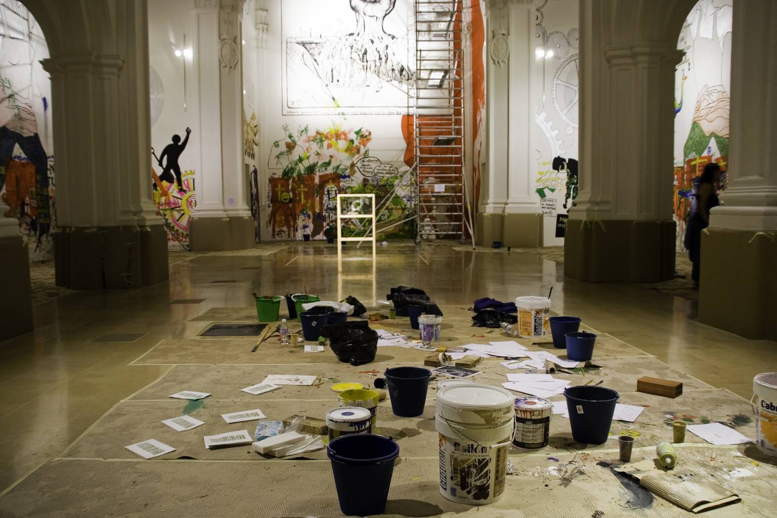 The piece fell within the circumstances created by the call to General Strike in Spain on September 29, 2010. This was the moment in which the piece was being physically produced in the exhibition space. It began with indications to paint on the walls images of the revolutionary iconographic tradition of several leftist political cultures. The purpose is to create a space inviting the participation of the audience by inciting it to paint and create its propaganda proposals on predetermined images. The intention is to generate new images having to do with the topic of the political expression. The artist makes two traditions of political production coincide: participation art and mural tradition as a way to social unrest. The mural’s weave and the series of phases the artist expects to introduce in the painting try to absorb a temporary circumstance: the call to general strike with which, on September 2010, trade unions, citizens and activists intend to question the economic and public financial policies with which the Spanish government wanted to control the variations in the capitalist crisis. On the basis of the implementation of this mural, an attempt at inciting reflection on the political effectiveness of images in the creation of a community and in citizen participation in political processes is made. The purpose is to present a frustrated utopia in which representational art reflects a process as changing as politics and as volatile as public opinion on something as unchangeable as a visual image painted in a mural.