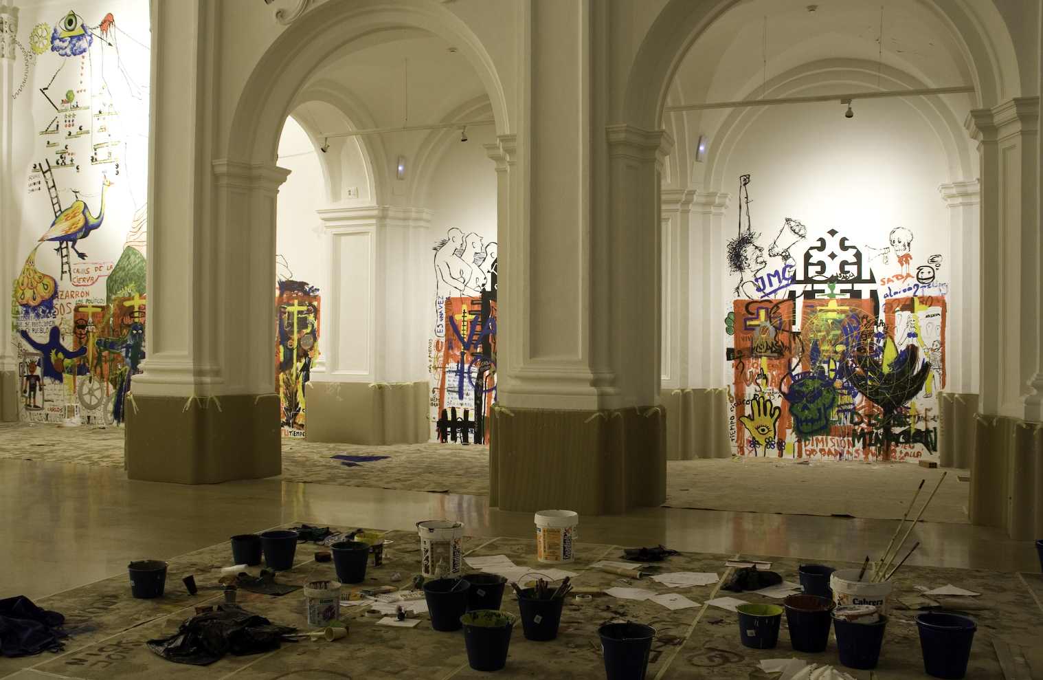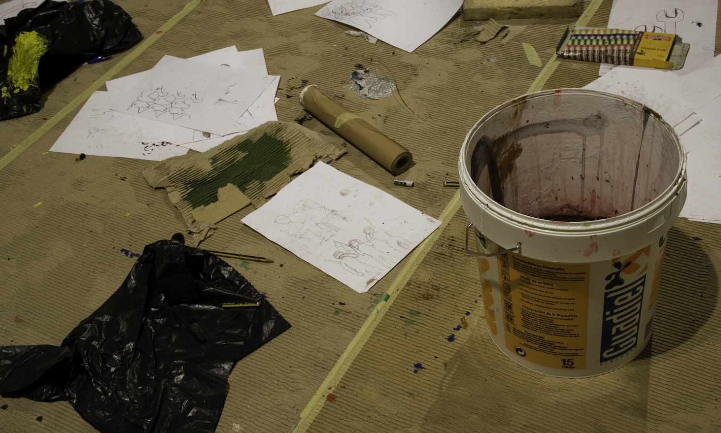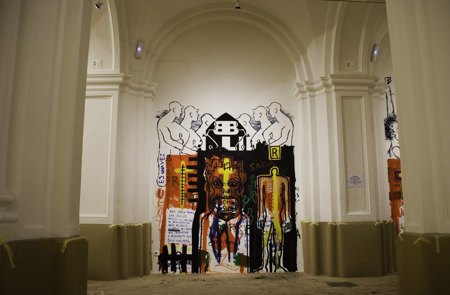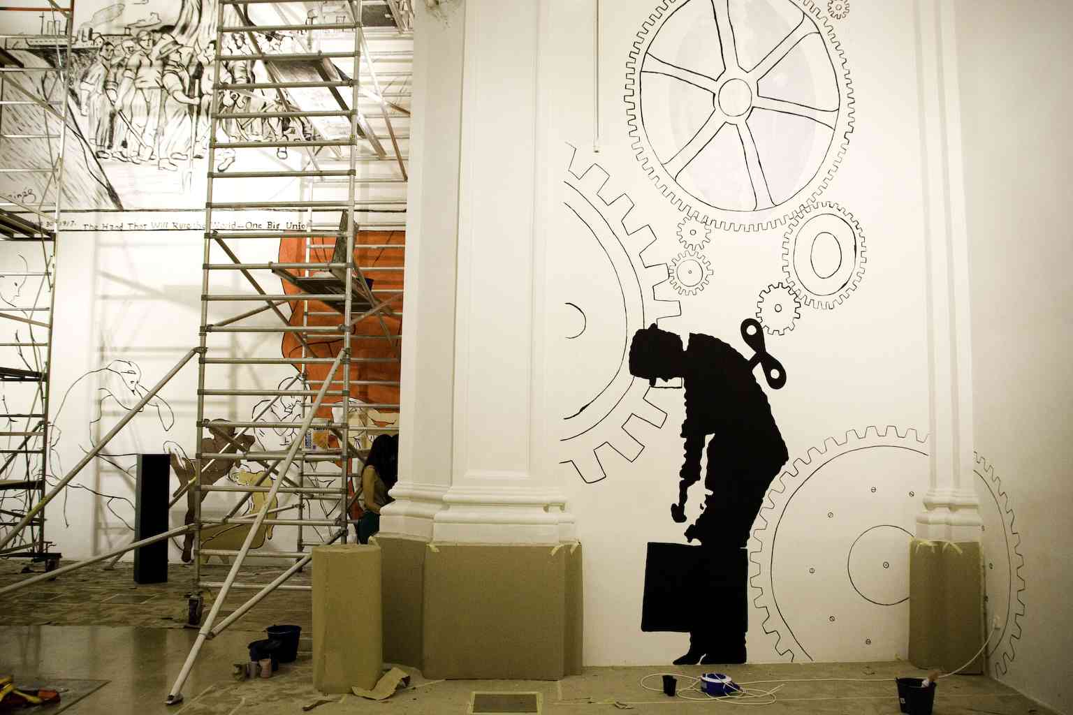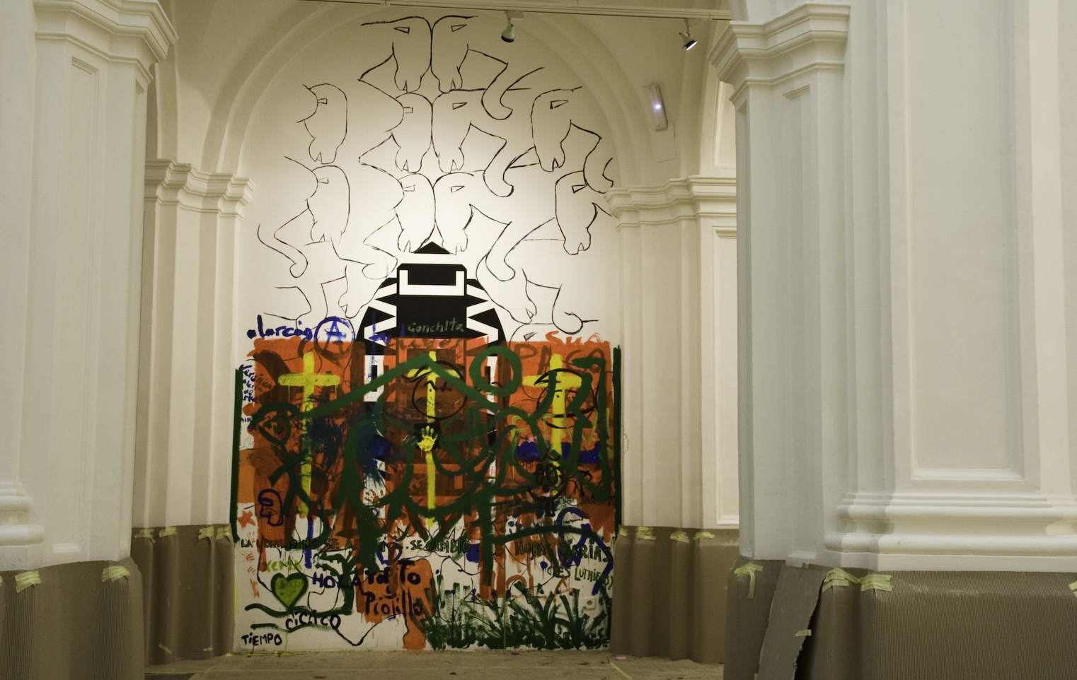 The piece fell within the circumstances created by the call to General Strike in Spain on September 29, 2010. This was the moment in which the piece was being physically produced in the exhibition space. It began with indications to paint on the walls images of the revolutionary iconographic tradition of several leftist political cultures. The purpose is to create a space inviting the participation of the audience by inciting it to paint and create its propaganda proposals on predetermined images. The intention is to generate new images having to do with the topic of the political expression. The artist makes two traditions of political production coincide: participation art and mural tradition as a way to social unrest. The mural’s weave and the series of phases the artist expects to introduce in the painting try to absorb a temporary circumstance: the call to general strike with which, on September 2010, trade unions, citizens and activists intend to question the economic and public financial policies with which the Spanish government wanted to control the variations in the capitalist crisis. On the basis of the implementation of this mural, an attempt at inciting reflection on the political effectiveness of images in the creation of a community and in citizen participation in political processes is made. The purpose is to present a frustrated utopia in which representational art reflects a process as changing as politics and as volatile as public opinion on something as unchangeable as a visual image painted in a mural.