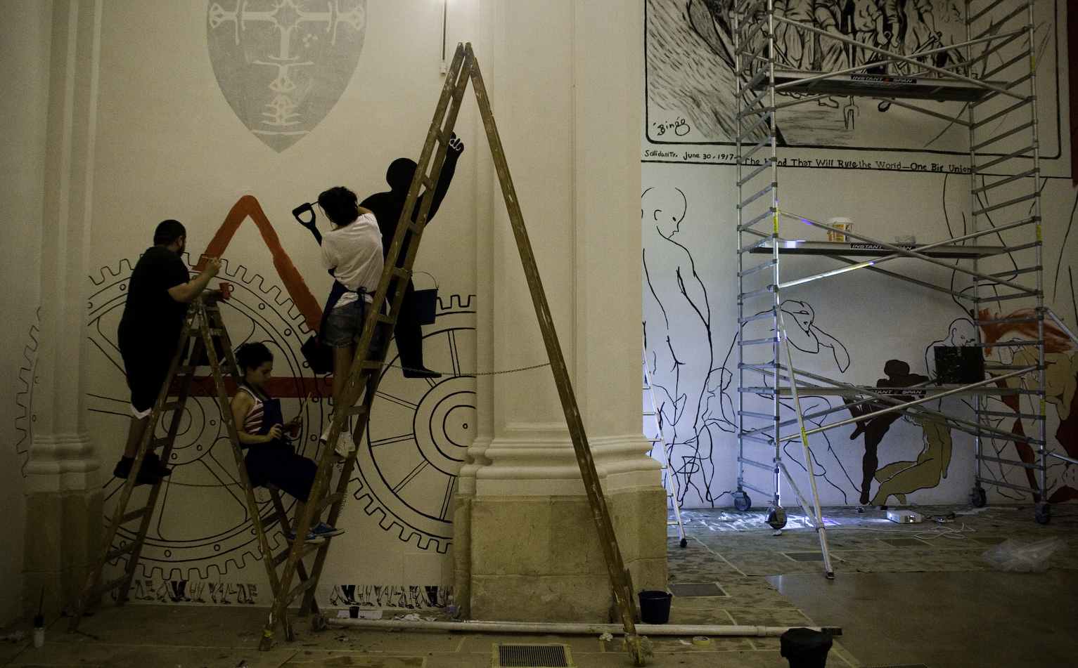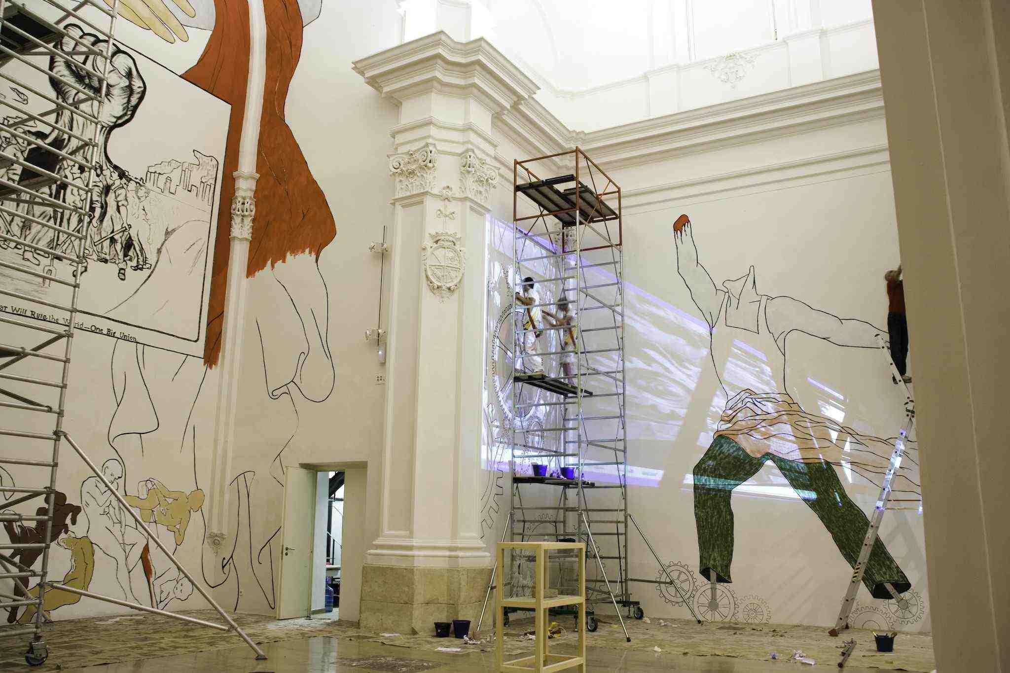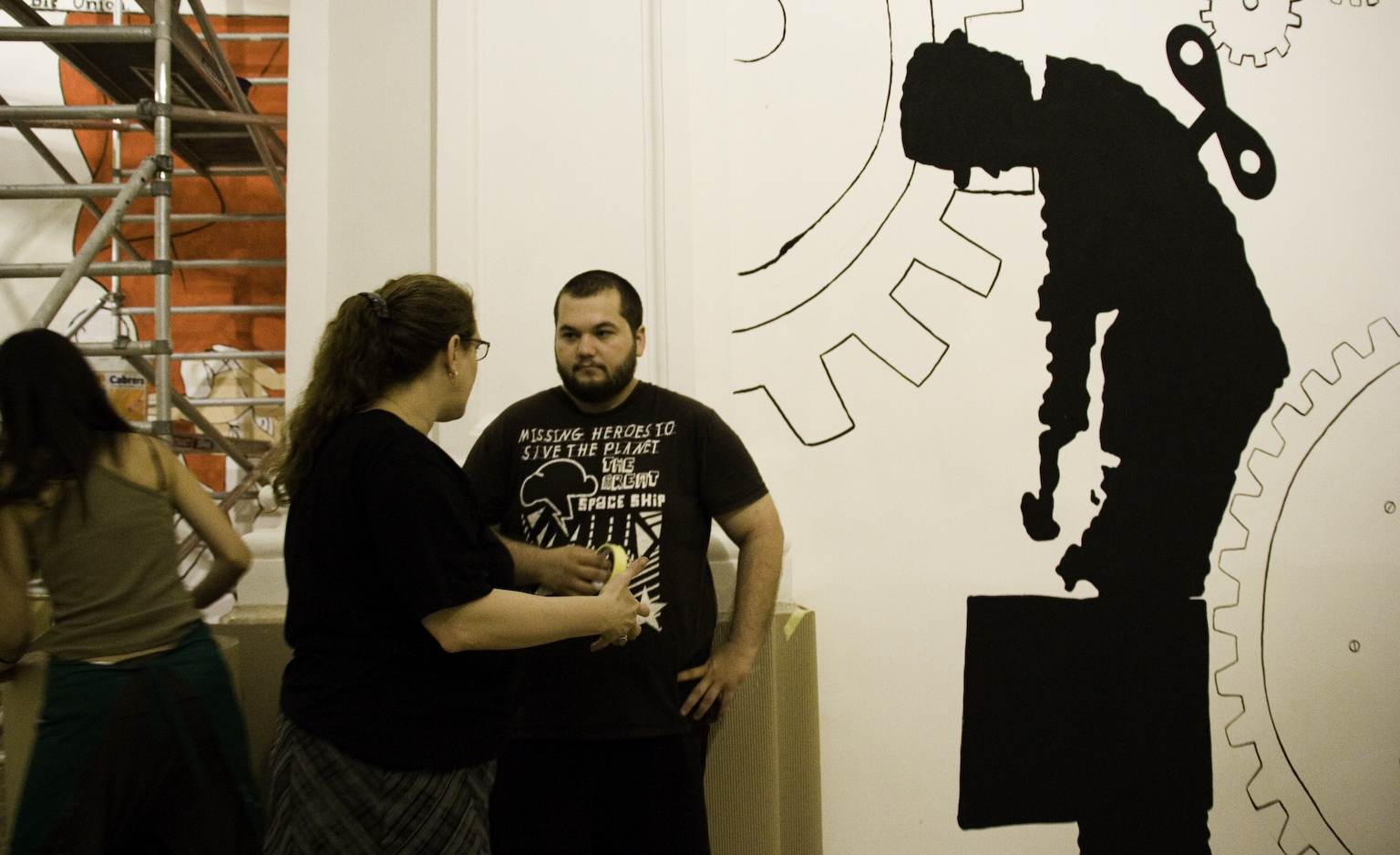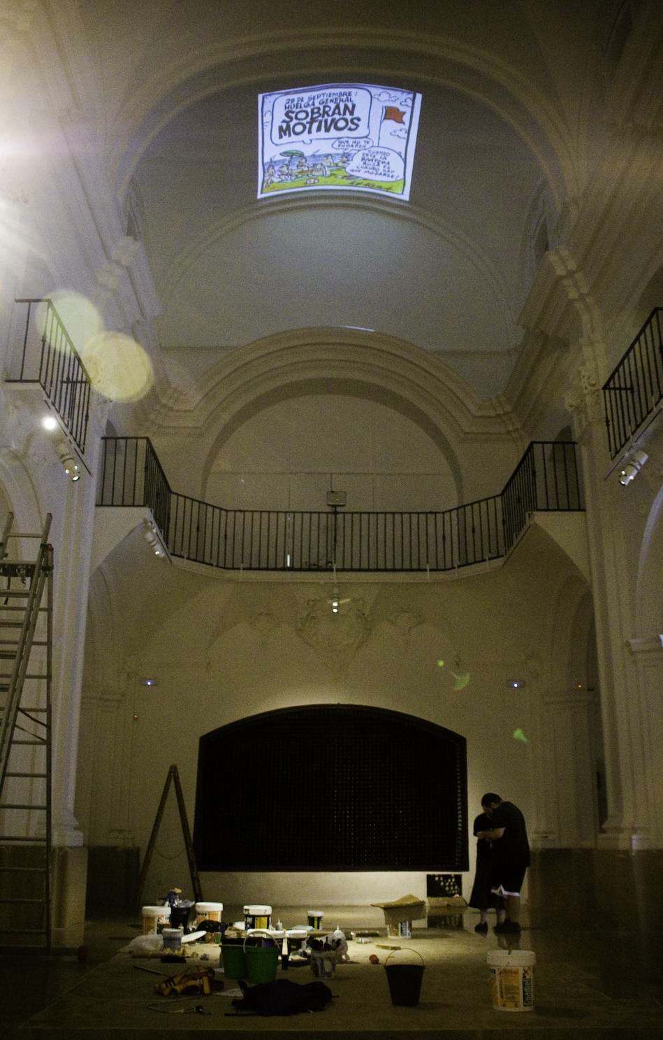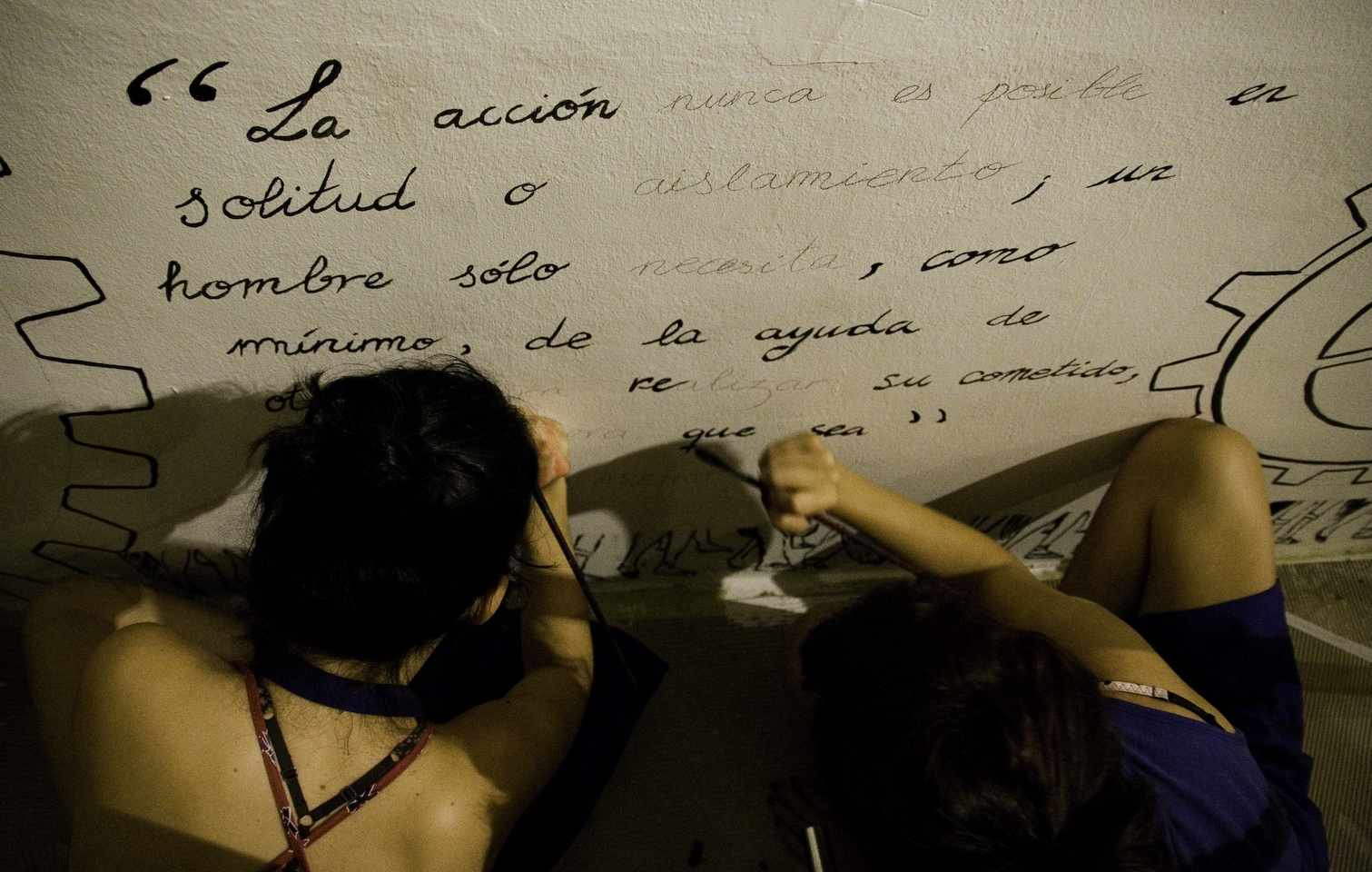 The piece fell within the circumstances created by the call to General Strike in Spain on September 29, 2010. This was the moment in which the piece was being physically produced in the exhibition space. It began with indications to paint on the walls images of the revolutionary iconographic tradition of several leftist political cultures. The purpose is to create a space inviting the participation of the audience by inciting it to paint and create its propaganda proposals on predetermined images. The intention is to generate new images having to do with the topic of the political expression. The artist makes two traditions of political production coincide: participation art and mural tradition as a way to social unrest. The mural’s weave and the series of phases the artist expects to introduce in the painting try to absorb a temporary circumstance: the call to general strike with which, on September 2010, trade unions, citizens and activists intend to question the economic and public financial policies with which the Spanish government wanted to control the variations in the capitalist crisis. On the basis of the implementation of this mural, an attempt at inciting reflection on the political effectiveness of images in the creation of a community and in citizen participation in political processes is made. The purpose is to present a frustrated utopia in which representational art reflects a process as changing as politics and as volatile as public opinion on something as unchangeable as a visual image painted in a mural.