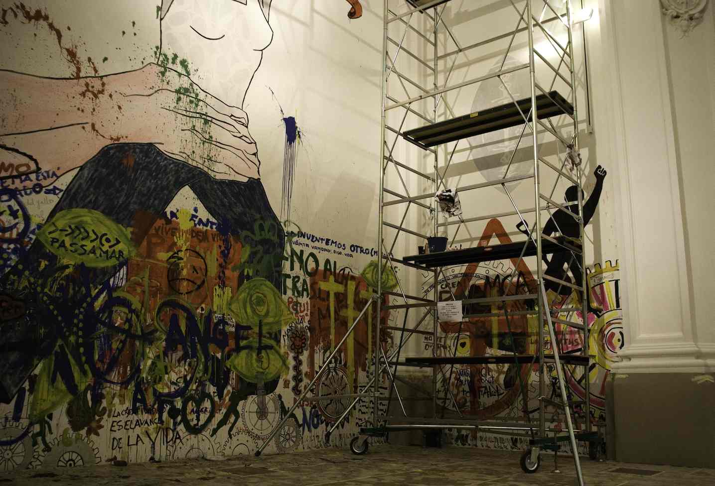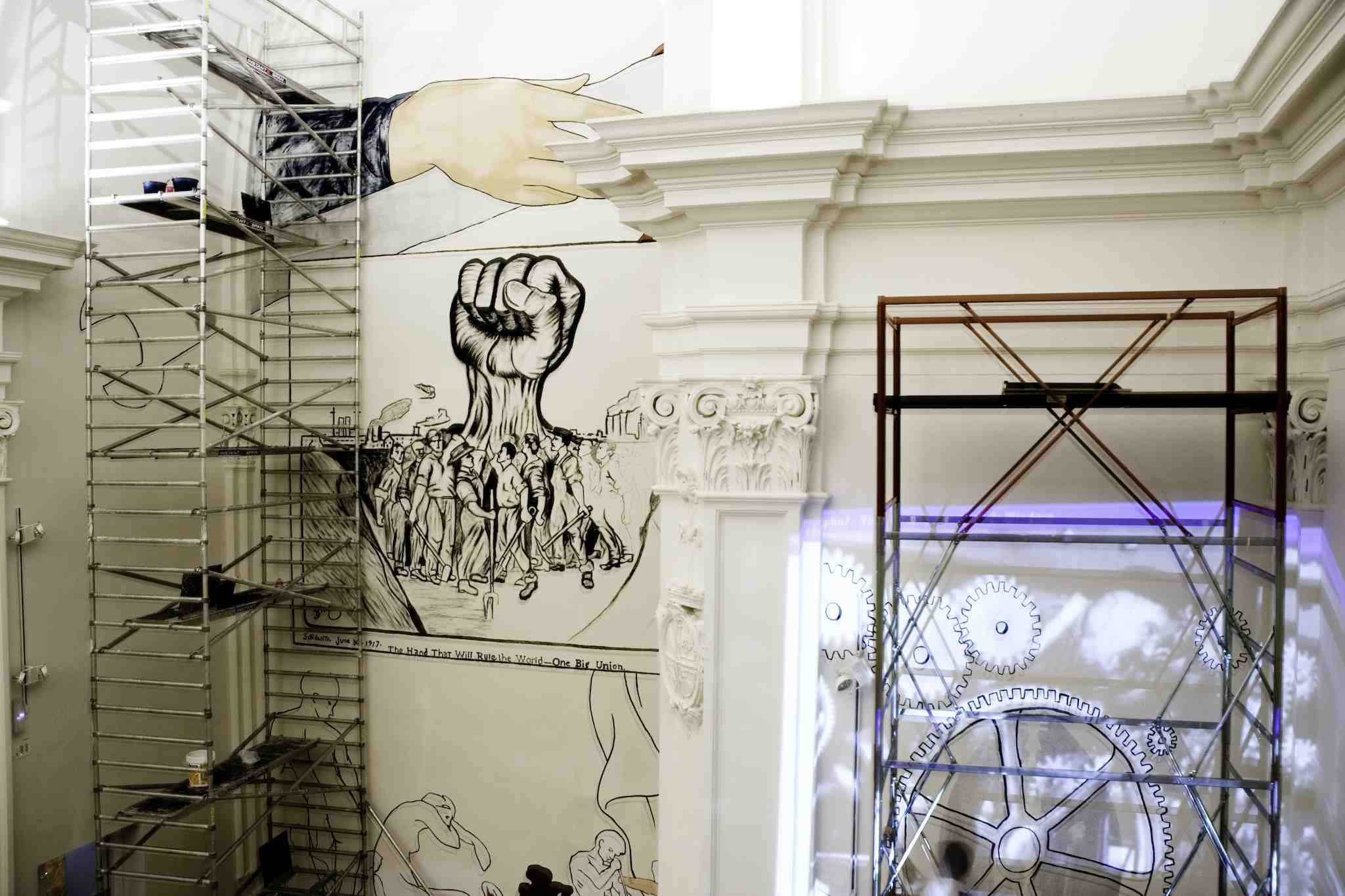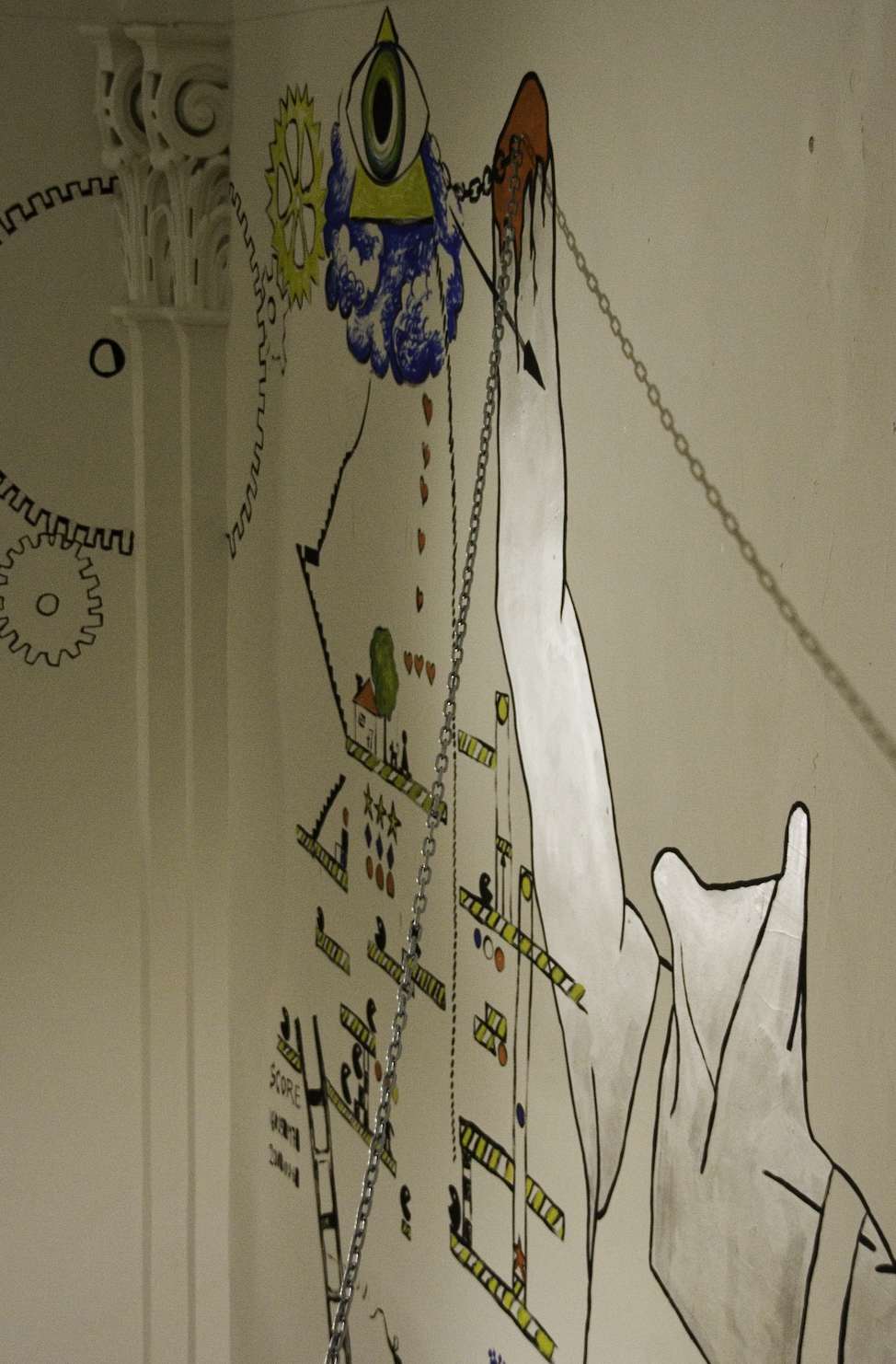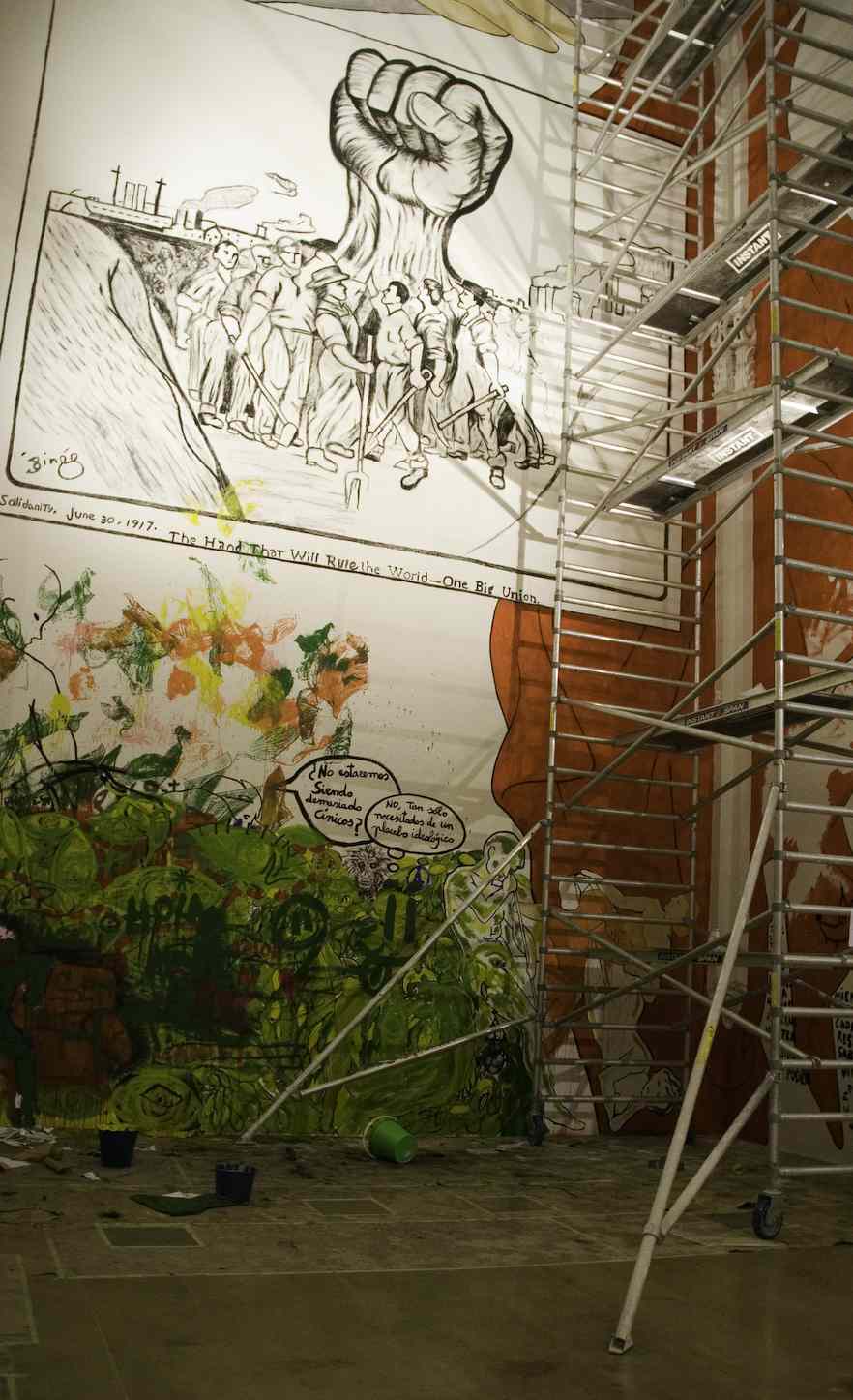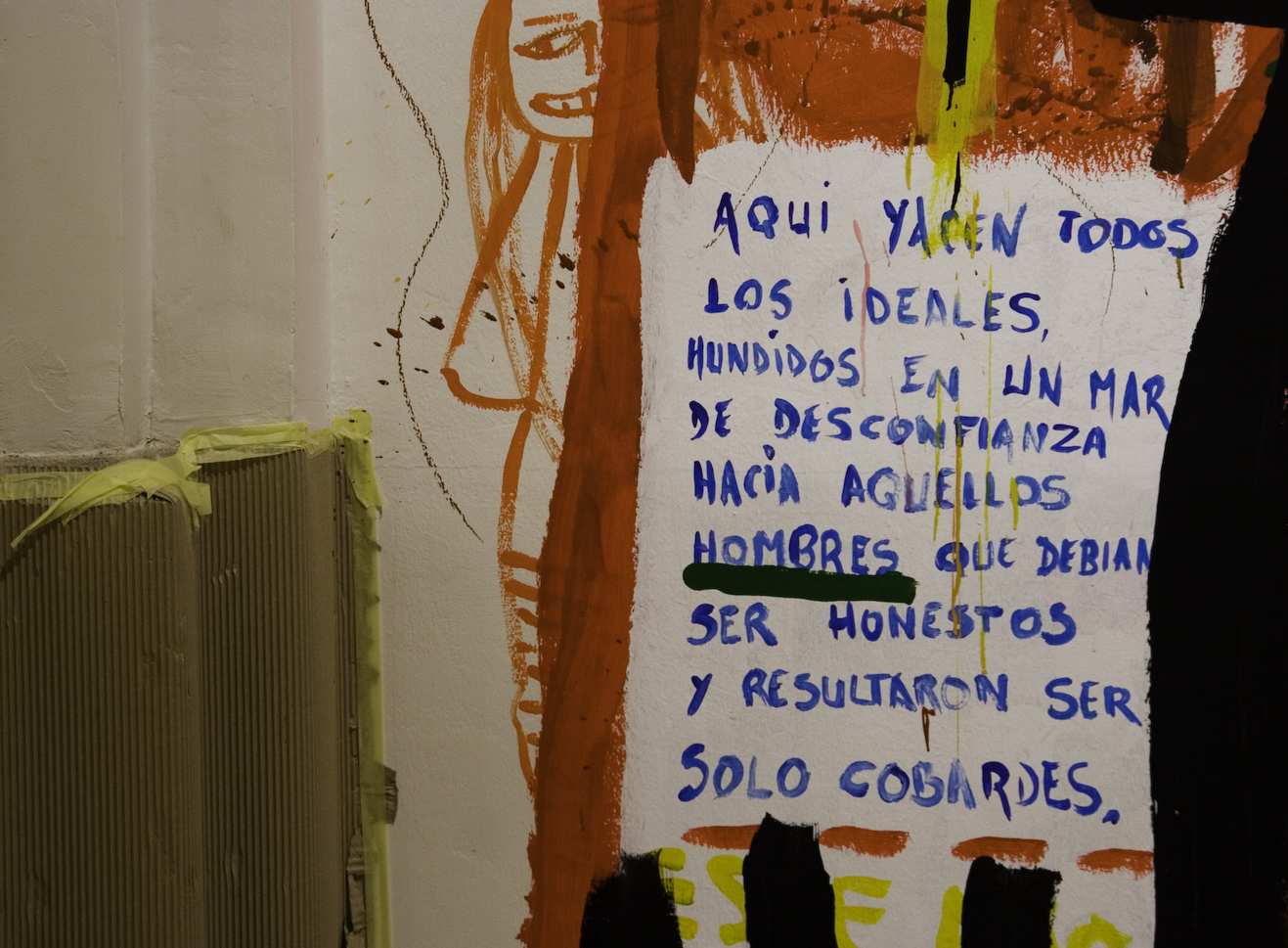 The piece fell within the circumstances created by the call to General Strike in Spain on September 29, 2010. This was the moment in which the piece was being physically produced in the exhibition space. It began with indications to paint on the walls images of the revolutionary iconographic tradition of several leftist political cultures. The purpose is to create a space inviting the participation of the audience by inciting it to paint and create its propaganda proposals on predetermined images. The intention is to generate new images having to do with the topic of the political expression. The artist makes two traditions of political production coincide: participation art and mural tradition as a way to social unrest. The mural’s weave and the series of phases the artist expects to introduce in the painting try to absorb a temporary circumstance: the call to general strike with which, on September 2010, trade unions, citizens and activists intend to question the economic and public financial policies with which the Spanish government wanted to control the variations in the capitalist crisis. On the basis of the implementation of this mural, an attempt at inciting reflection on the political effectiveness of images in the creation of a community and in citizen participation in political processes is made. The purpose is to present a frustrated utopia in which representational art reflects a process as changing as politics and as volatile as public opinion on something as unchangeable as a visual image painted in a mural.
