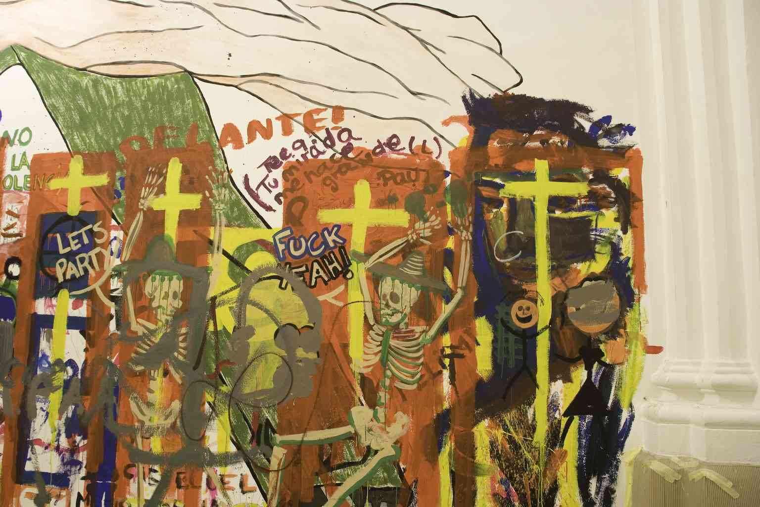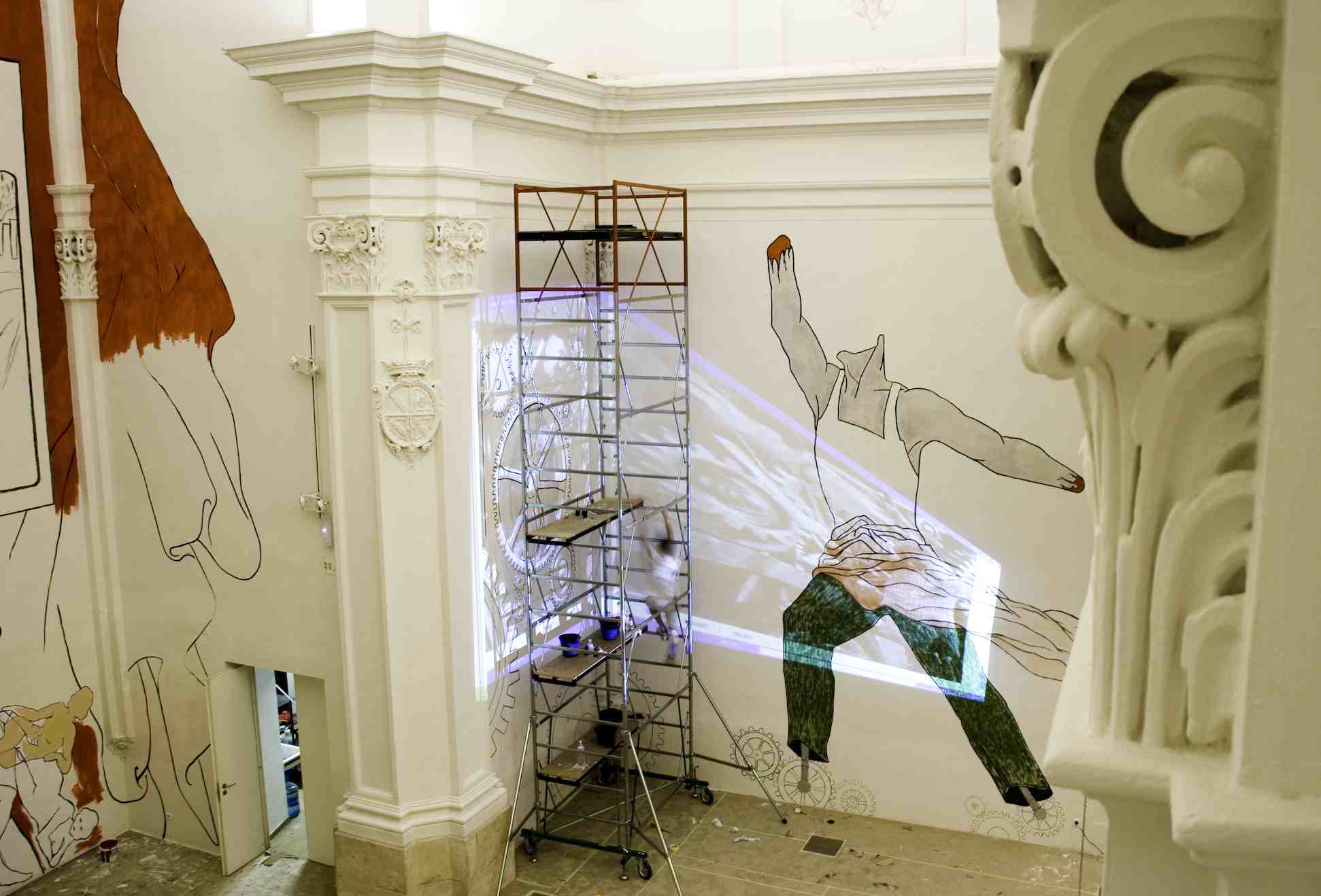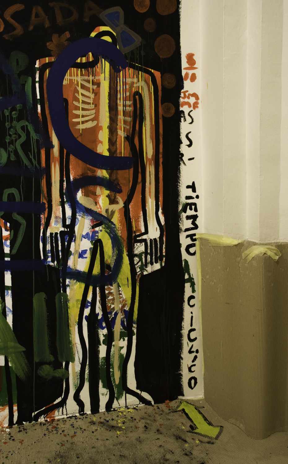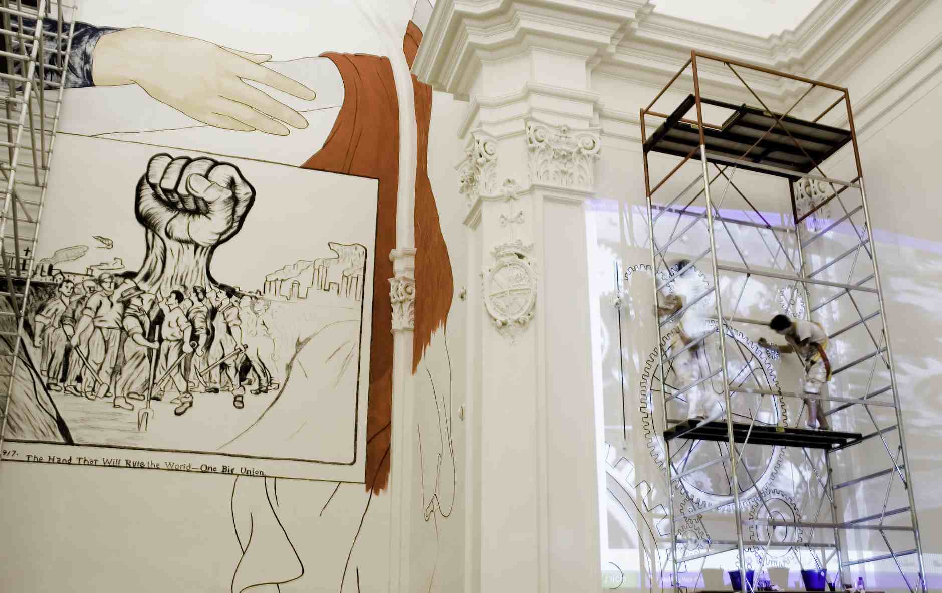 The piece fell within the circumstances created by the call to General Strike in Spain on September 29, 2010. This was the moment in which the piece was being physically produced in the exhibition space. It began with indications to paint on the walls images of the revolutionary iconographic tradition of several leftist political cultures. The purpose is to create a space inviting the participation of the audience by inciting it to paint and create its propaganda proposals on predetermined images. The intention is to generate new images having to do with the topic of the political expression. The artist makes two traditions of political production coincide: participation art and mural tradition as a way to social unrest. The mural’s weave and the series of phases the artist expects to introduce in the painting try to absorb a temporary circumstance: the call to general strike with which, on September 2010, trade unions, citizens and activists intend to question the economic and public financial policies with which the Spanish government wanted to control the variations in the capitalist crisis. On the basis of the implementation of this mural, an attempt at inciting reflection on the political effectiveness of images in the creation of a community and in citizen participation in political processes is made. The purpose is to present a frustrated utopia in which representational art reflects a process as changing as politics and as volatile as public opinion on something as unchangeable as a visual image painted in a mural.