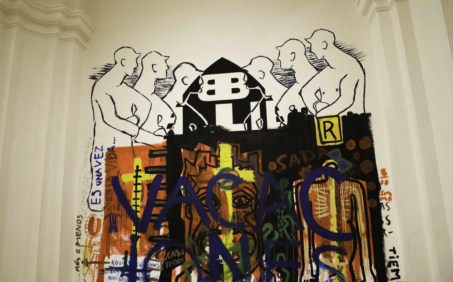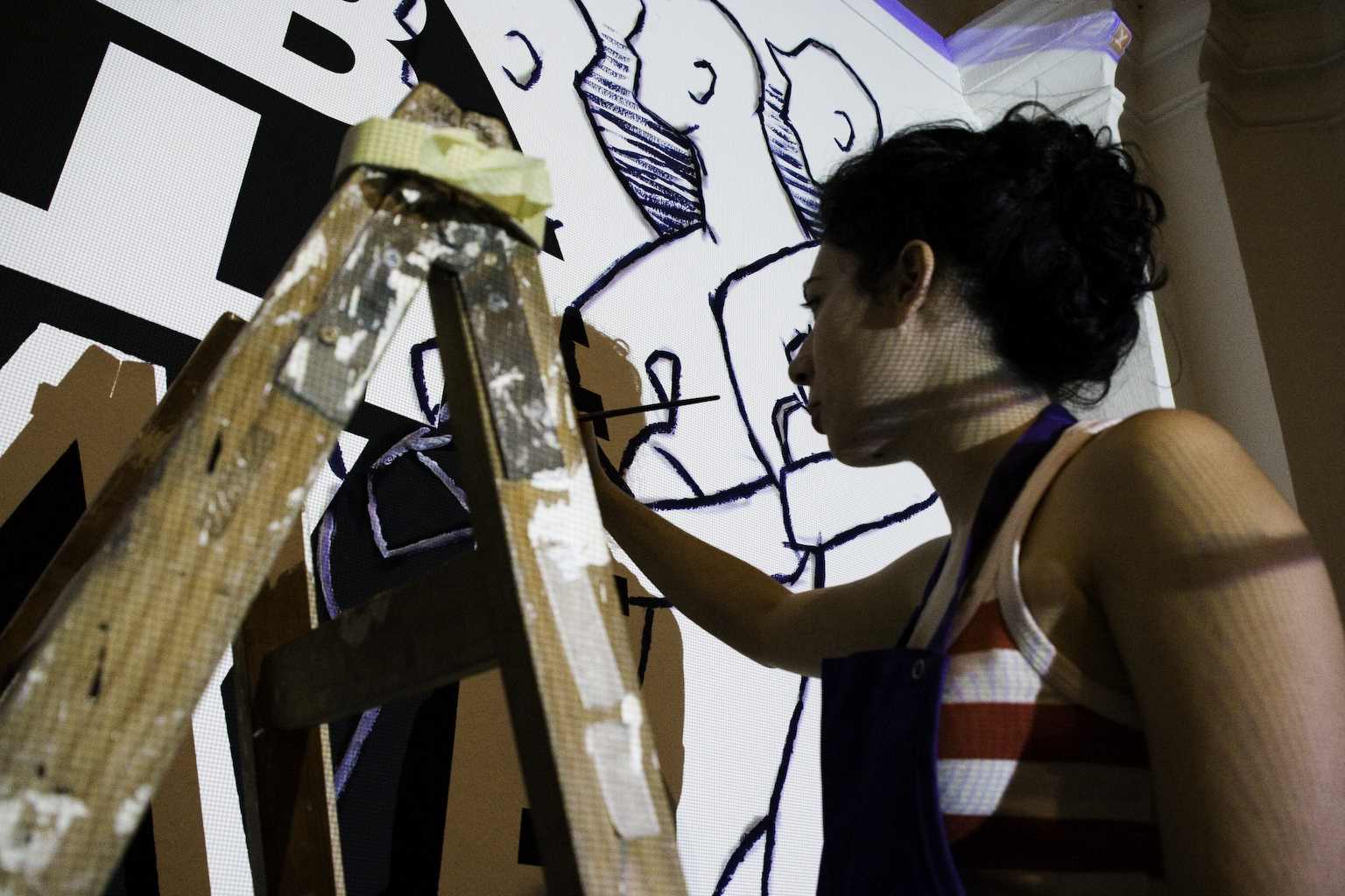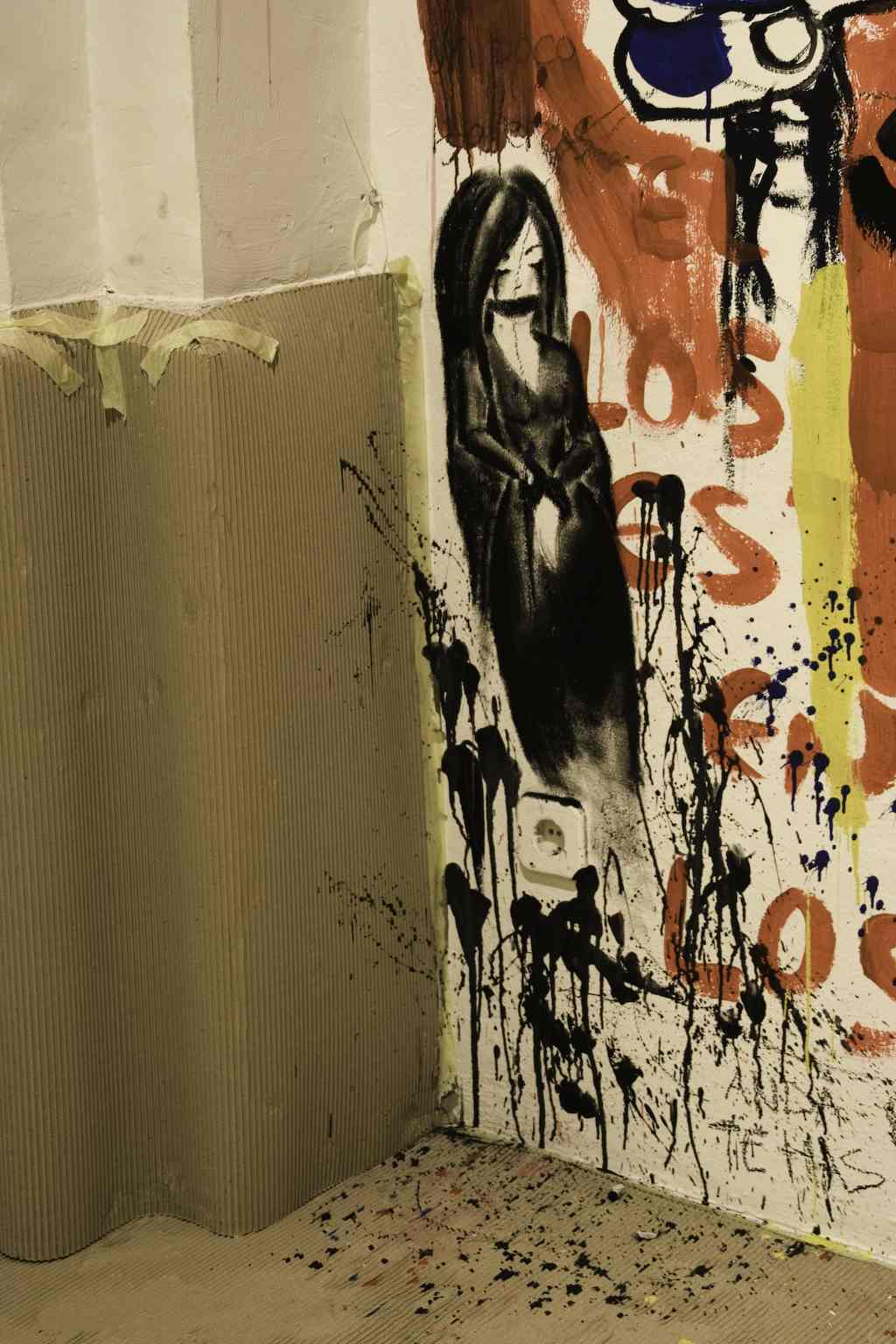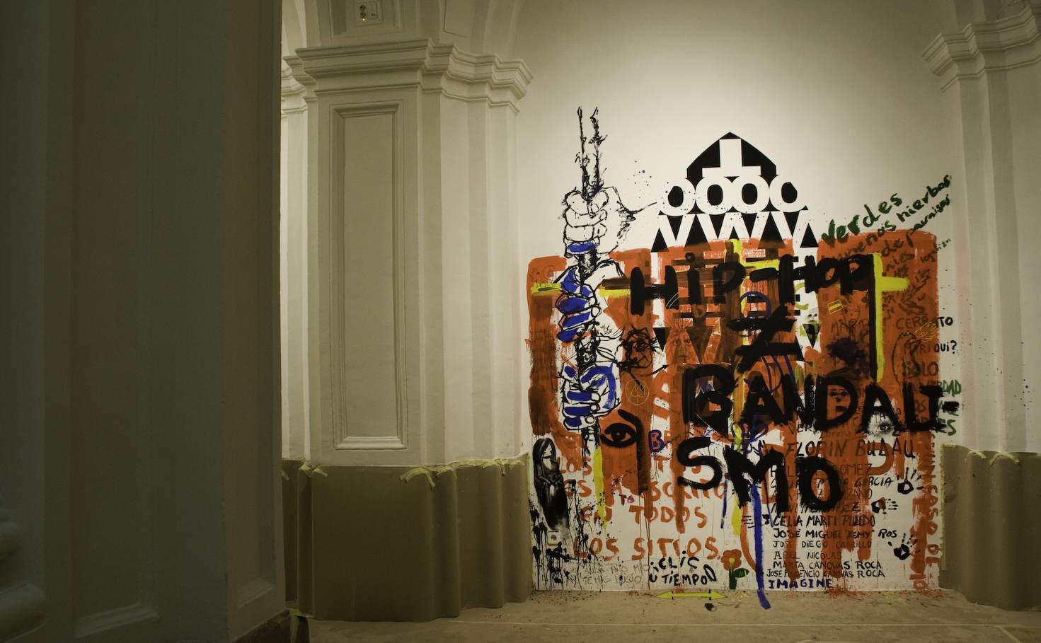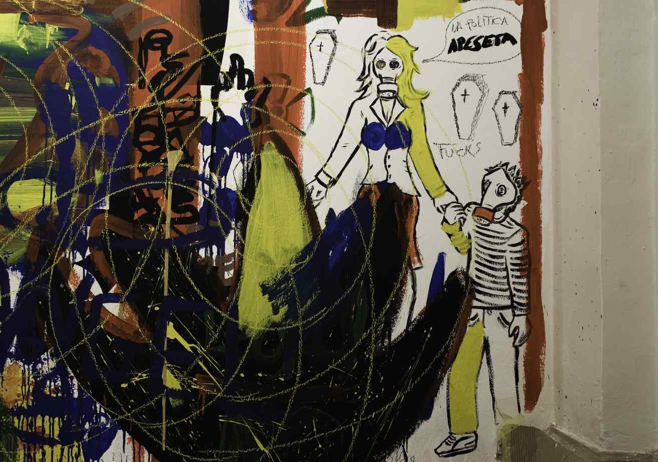 The piece fell within the circumstances created by the call to General Strike in Spain on September 29, 2010. This was the moment in which the piece was being physically produced in the exhibition space. It began with indications to paint on the walls images of the revolutionary iconographic tradition of several leftist political cultures. The purpose is to create a space inviting the participation of the audience by inciting it to paint and create its propaganda proposals on predetermined images. The intention is to generate new images having to do with the topic of the political expression. The artist makes two traditions of political production coincide: participation art and mural tradition as a way to social unrest. The mural’s weave and the series of phases the artist expects to introduce in the painting try to absorb a temporary circumstance: the call to general strike with which, on September 2010, trade unions, citizens and activists intend to question the economic and public financial policies with which the Spanish government wanted to control the variations in the capitalist crisis. On the basis of the implementation of this mural, an attempt at inciting reflection on the political effectiveness of images in the creation of a community and in citizen participation in political processes is made. The purpose is to present a frustrated utopia in which representational art reflects a process as changing as politics and as volatile as public opinion on something as unchangeable as a visual image painted in a mural.