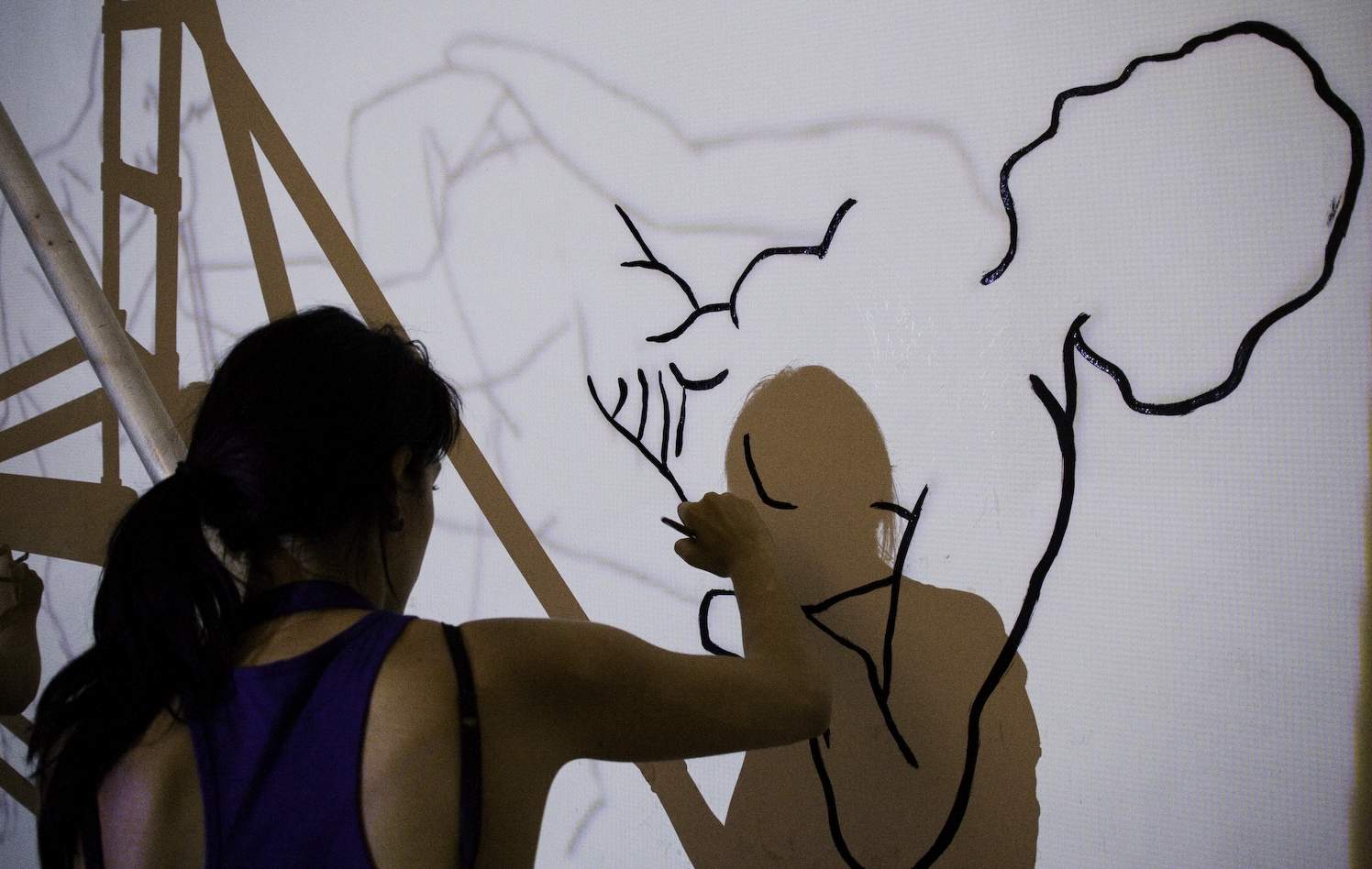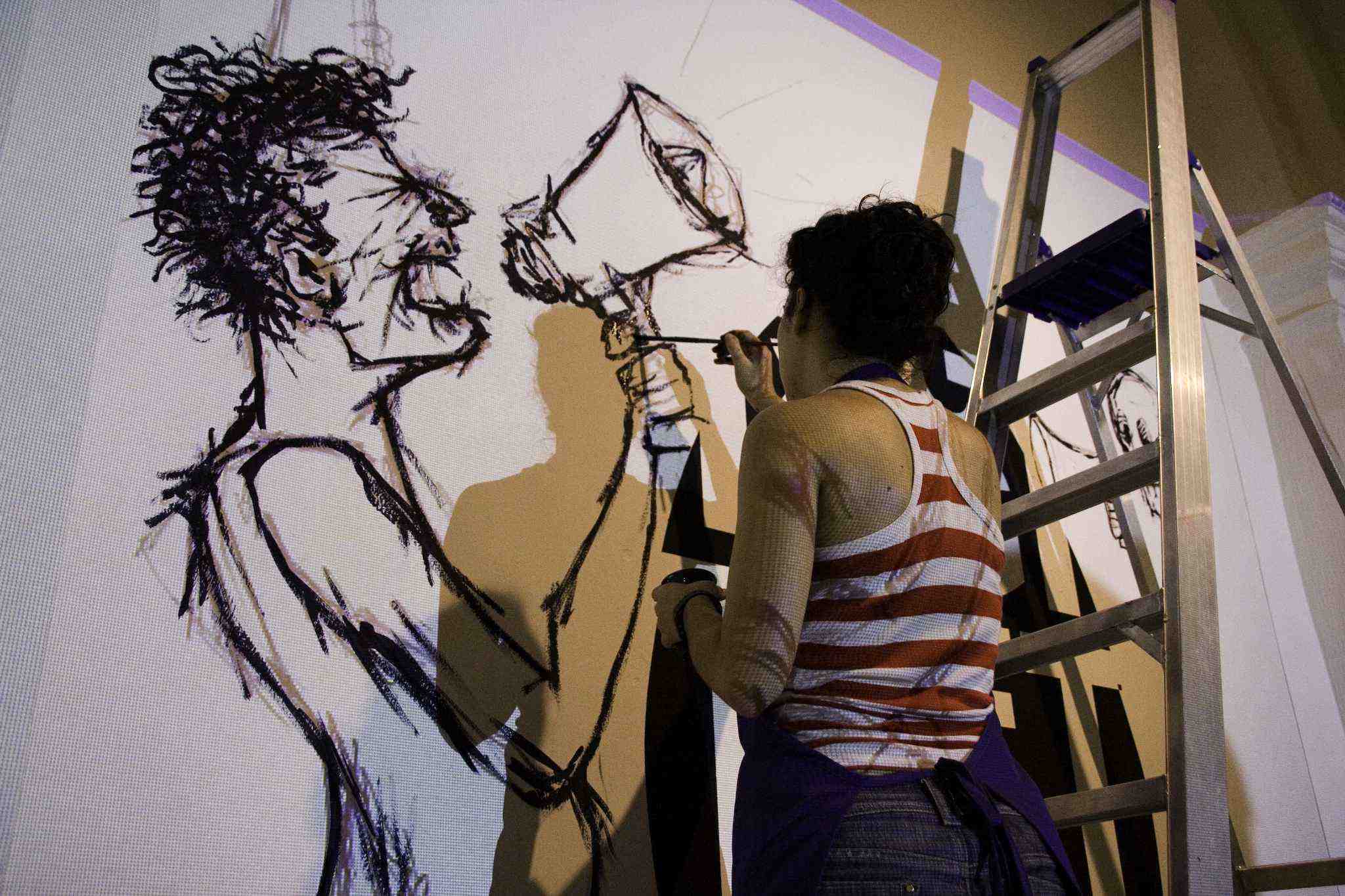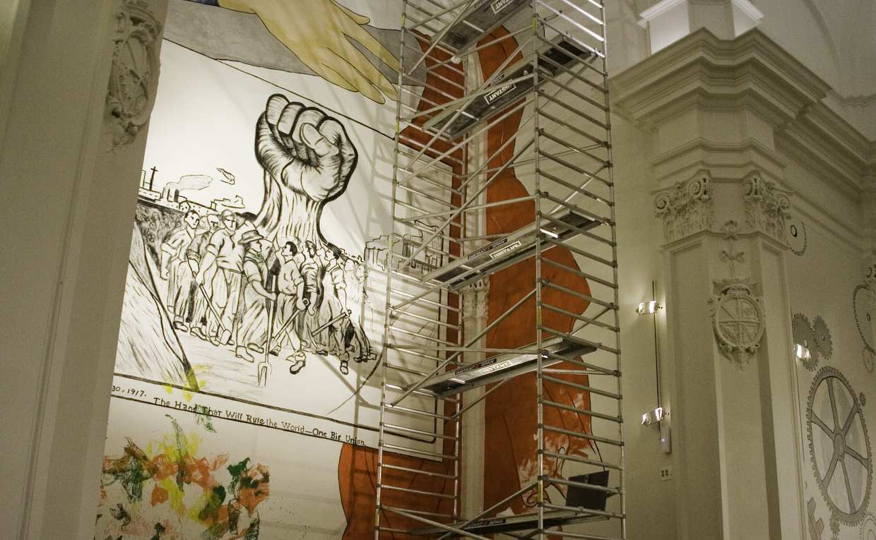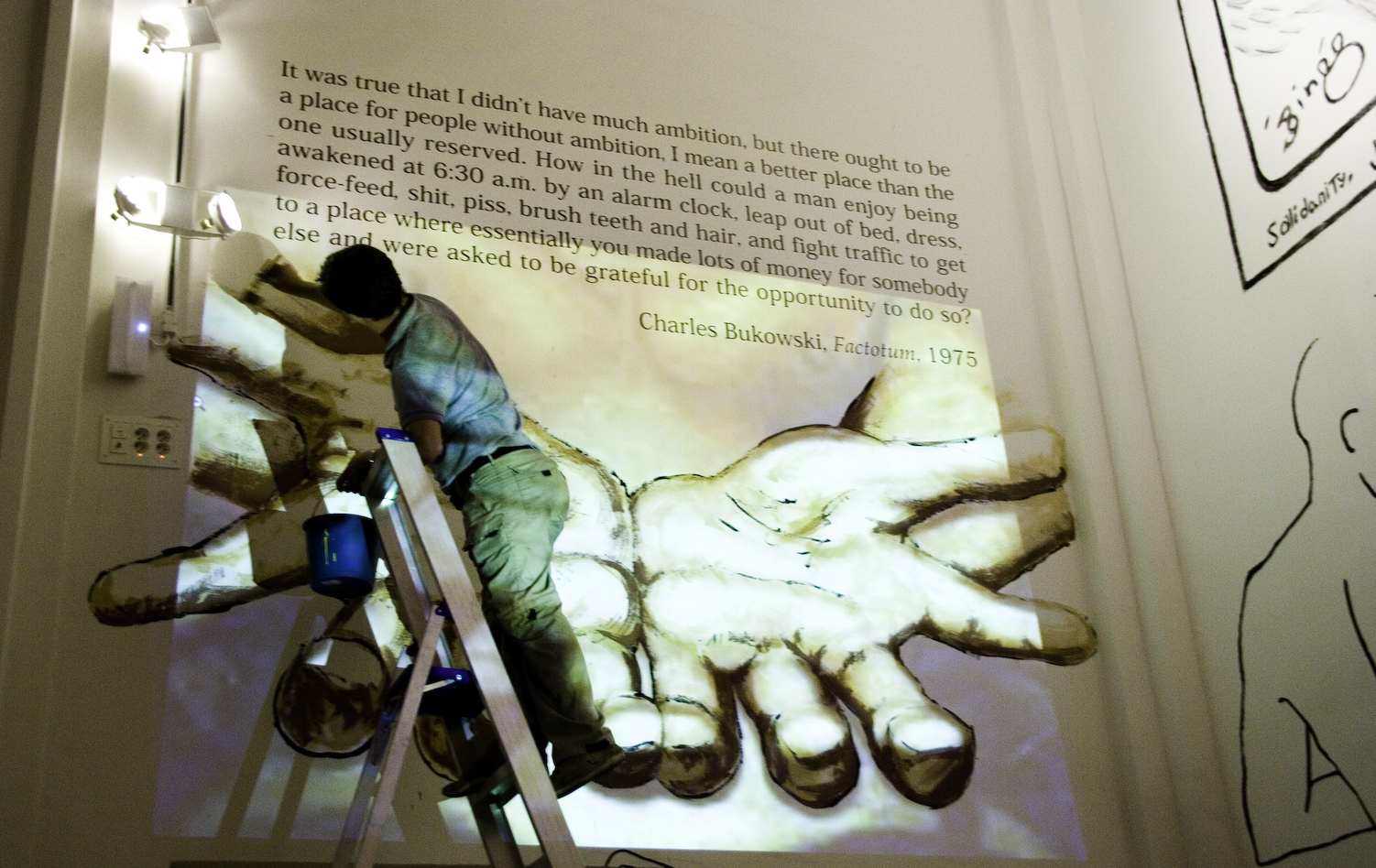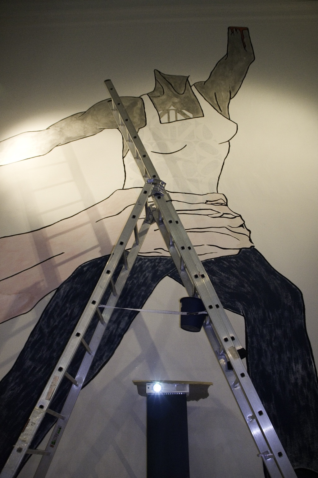 The piece fell within the circumstances created by the call to General Strike in Spain on September 29, 2010. This was the moment in which the piece was being physically produced in the exhibition space. It began with indications to paint on the walls images of the revolutionary iconographic tradition of several leftist political cultures. The purpose is to create a space inviting the participation of the audience by inciting it to paint and create its propaganda proposals on predetermined images. The intention is to generate new images having to do with the topic of the political expression. The artist makes two traditions of political production coincide: participation art and mural tradition as a way to social unrest. The mural’s weave and the series of phases the artist expects to introduce in the painting try to absorb a temporary circumstance: the call to general strike with which, on September 2010, trade unions, citizens and activists intend to question the economic and public financial policies with which the Spanish government wanted to control the variations in the capitalist crisis. On the basis of the implementation of this mural, an attempt at inciting reflection on the political effectiveness of images in the creation of a community and in citizen participation in political processes is made. The purpose is to present a frustrated utopia in which representational art reflects a process as changing as politics and as volatile as public opinion on something as unchangeable as a visual image painted in a mural.