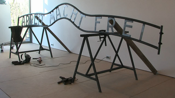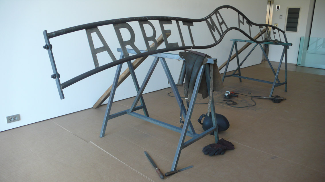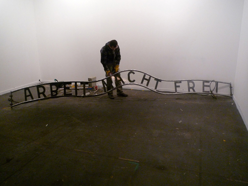 Además del simbolismo político e histórico de las palabras del letrero, el mecanismo para activar la pieza se basa en las vueltas y revueltas del mercado de oferta y demanda, así como en la plusvalía de un objeto que no es la reproducción del original (comprendido como documento histórico: Auschwitz es hoy un museo que recibe más de un millón de visitantes al año), sino una reproducción del objeto robado. La plusvalía, o sea, la ganancia que obtiene el empresario tomando los beneficios que producen los trabajadores con su trabajo, es en este caso la apropiación de la acción participativa y “festiva” del público que se revierte en el mercado del arte: el valor de la pieza se beneficia de la acción del público cuando activa la pieza. Pero la obra también muestra cómo una consigna histórica-política se convierte en un objeto que puede entrar en el mercado negro y caprichoso de rarezas y curiosidades y, al mismo tiempo, en el mercado del arte como obra que resume la farsa del objeto robado como reflexión sobre la política, el mercado, la historia y la economía.