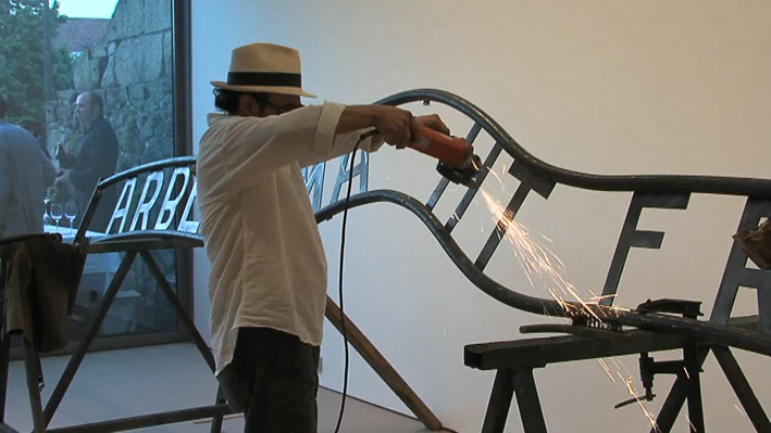 «…El público y los actores/voluntarios liberados activan el performance,mientras Plusvalía, proyectada en una Sala de Proyecciones ARCO y en la exposición de la Galería Juana de Aizpuru y en parte de la Fundación Rac La Promesa Política, marca el inicio de una serie de obras inspiradas en noticias publicadas por los medios y que se deslizan al ya mencionado nivel escultural con indicios teatrales. Plusvalía comienza con la noticia publicada en diciembre 2009 por la prensa sobre el robo del letrero de metal de la entrada del campo de concentración de Auschwitz -ahora un museo en memoria del holocausto con las conocidas palabras «Arbeit Macht Frei» (El trabajo libera) que se ha convertido en el emblema del cinismo nazi- por una pandilla delictiva con el propósito de venderlo en el mercado negro de objetos históricos y antiguos. La policía polaca encontró el letrero oculto y dividido en tres partes. Información posterior señaló que el robo había sido comisionado y que el precio convenido era de 150 000 euros.
