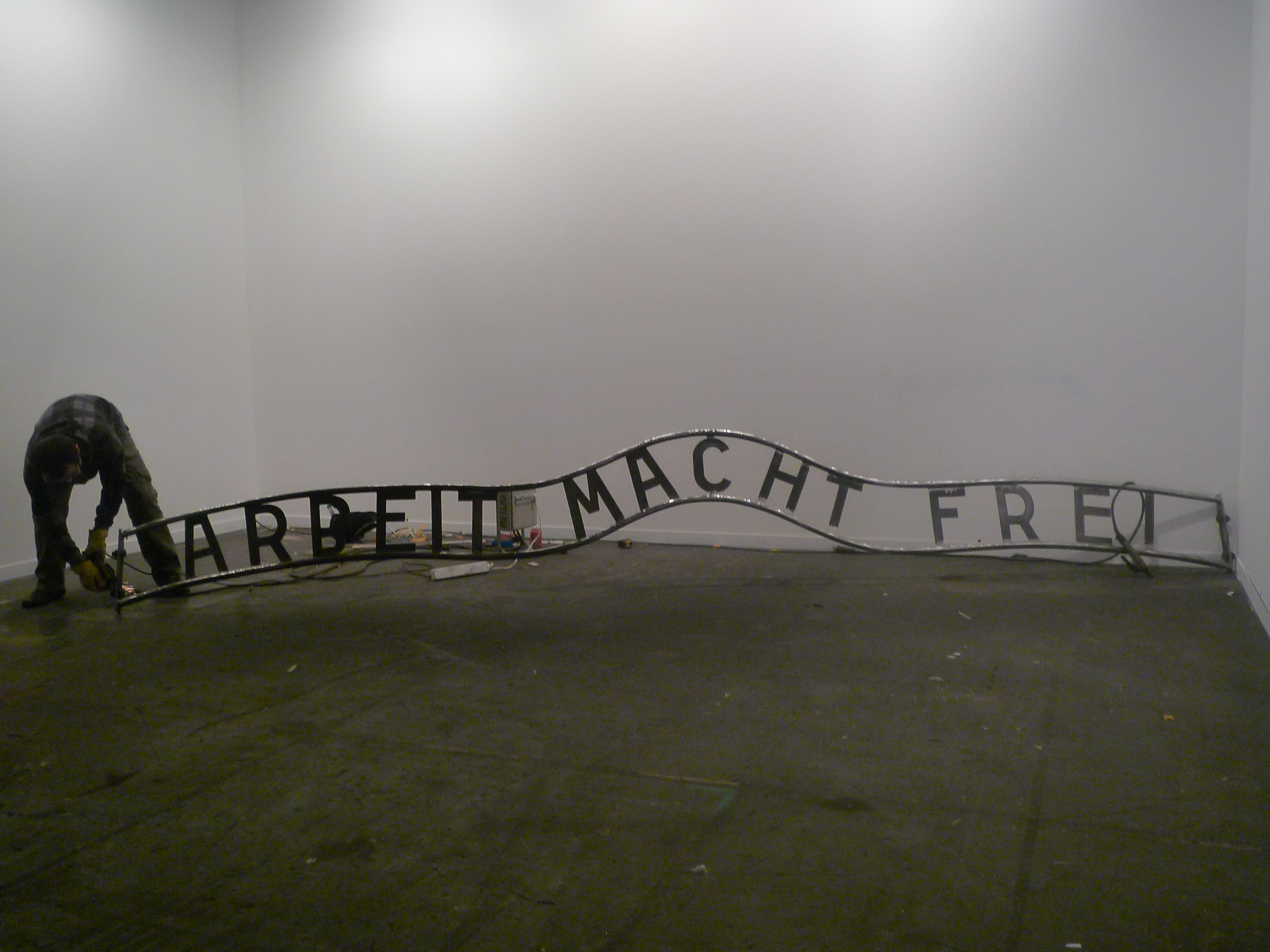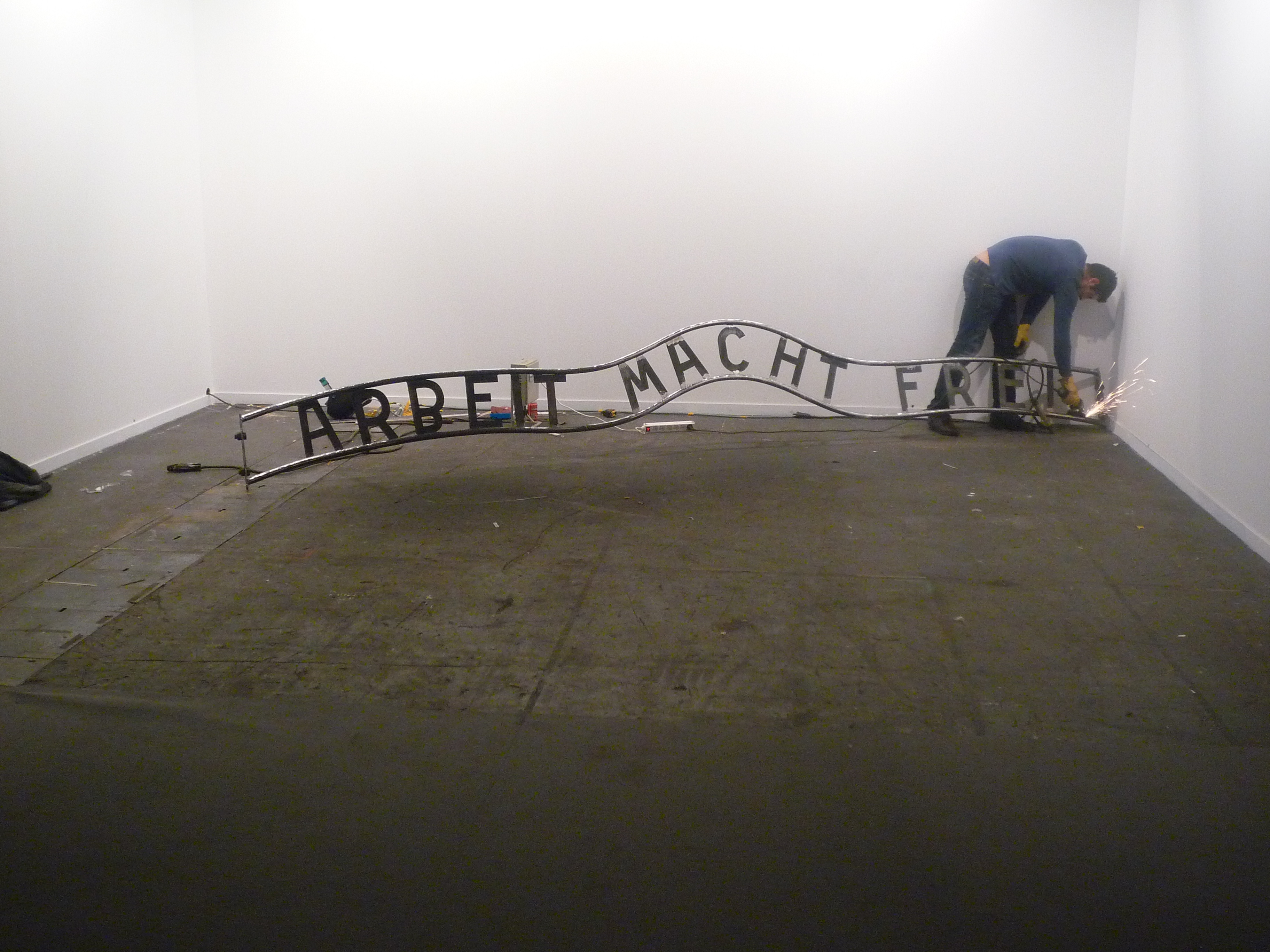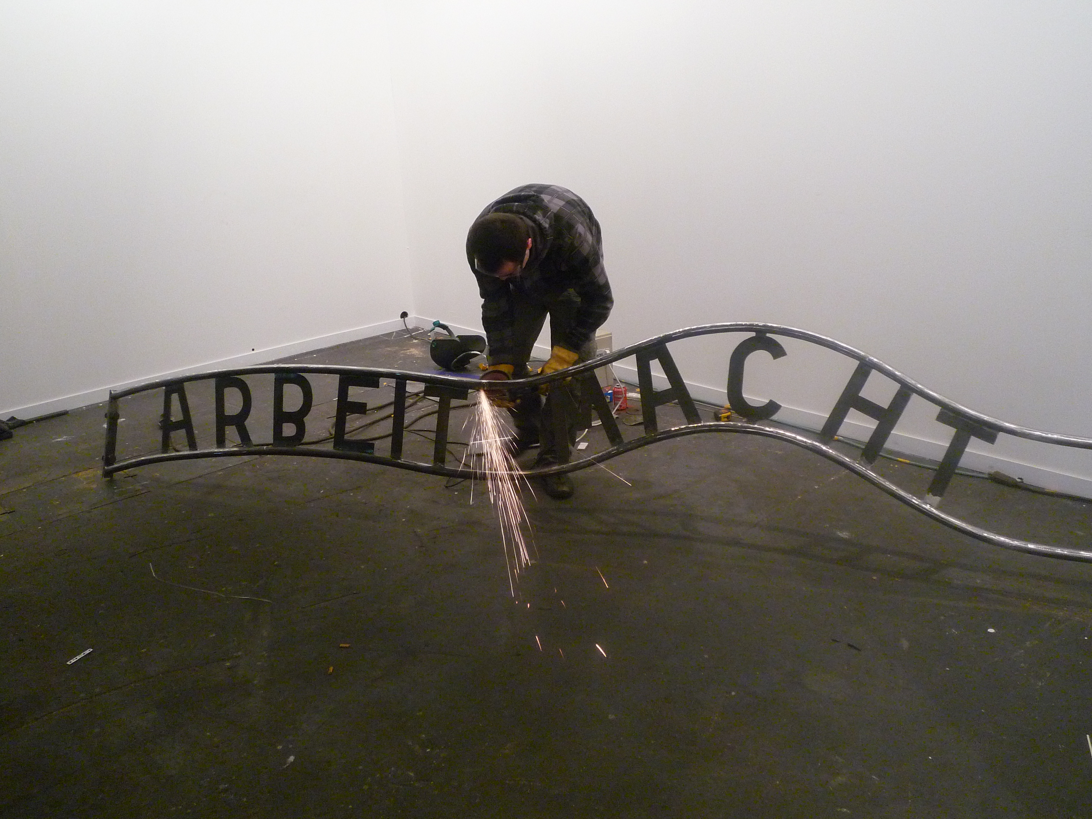 Plusvalía / Surplus value, was conceived after the robbery in December 2009 of the sign “Arbeit macht frei” (Work makes you free) from Auschwitz. This piece deals with the moment in which ethics steps in and transforms desire into something political. The piece can be installed in two states: activated and non-activated. At the time of activation, a worker constantly transforms the object with working tools.