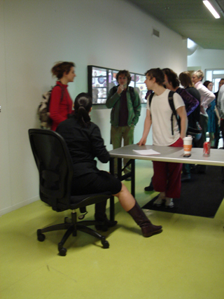 Bruguera’s performance is one of nine artists projects that have been commissioned by the Hyde Park Art Center as part of the Close Encounters exhibition. The performance was brilliantly performed by Cecilia Vargas (the role of desk officer), and also Sam Goodman and Clare Britt (who acted as provocateurs within the queue). Also, special thanks to Hannah Verrill who documented the performance.