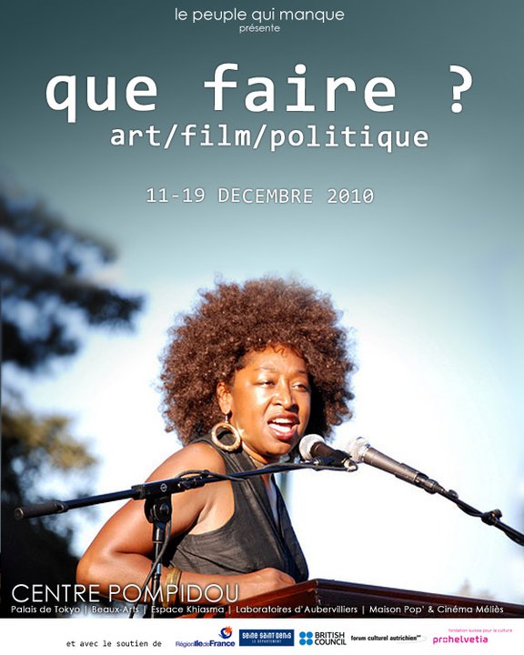 From the 11th to the 19th December 2010, the French curatorial structure le peuple qui manque presents Que faire ? Art, Film, politique – What is to be done ? Art, Film, Politics. During these days, this event want to get a fix about the new critical strategies and current reconfigurations of the bonds between Art & Politics in contemporary Art and more specifically in artists films and videos. The event consists of videos screenings – and of a critical symposium with artists and thinkers.